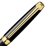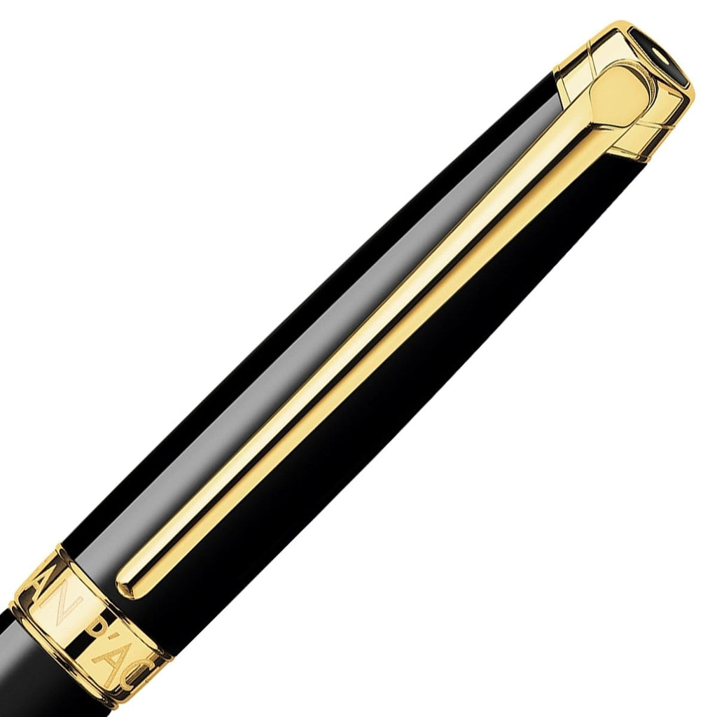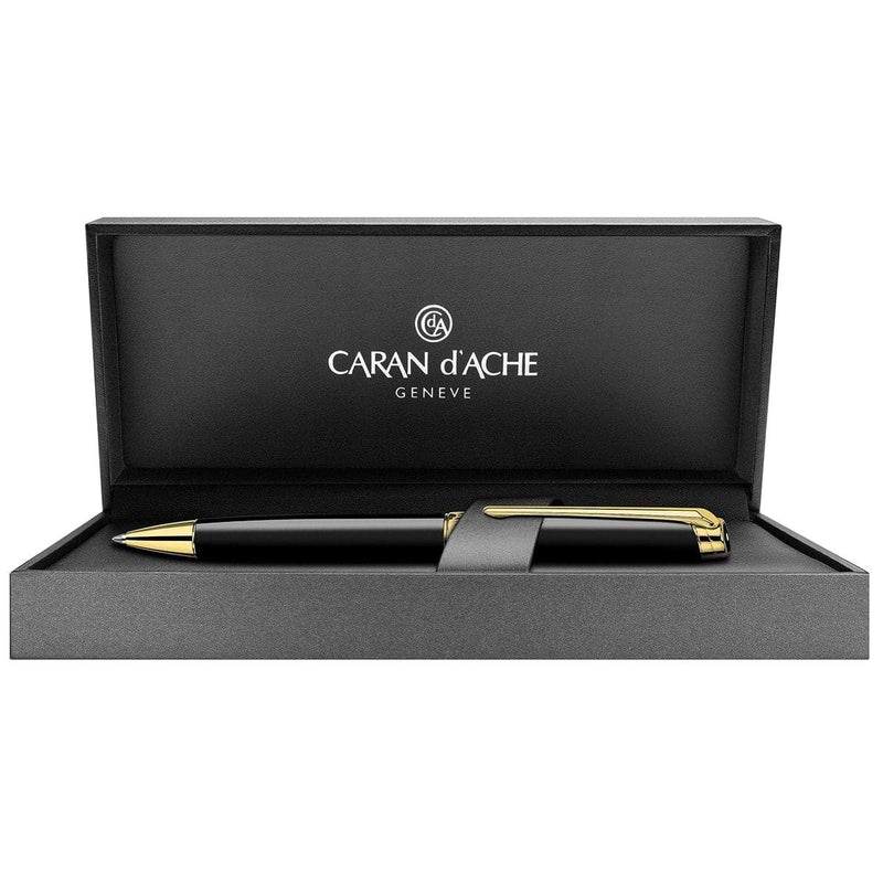 Der Caran d'Ache Léman Kugelschreiber in schwarz wird mit vergoldeten Zierelementen vervollständigt und hat ein Modern Classic Design.