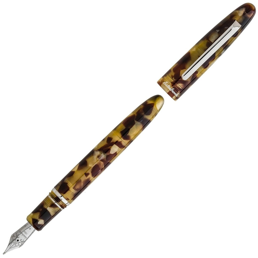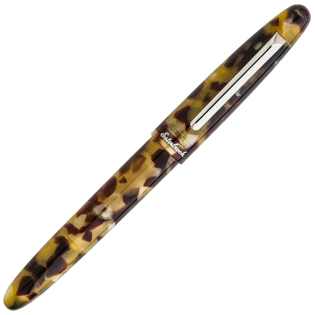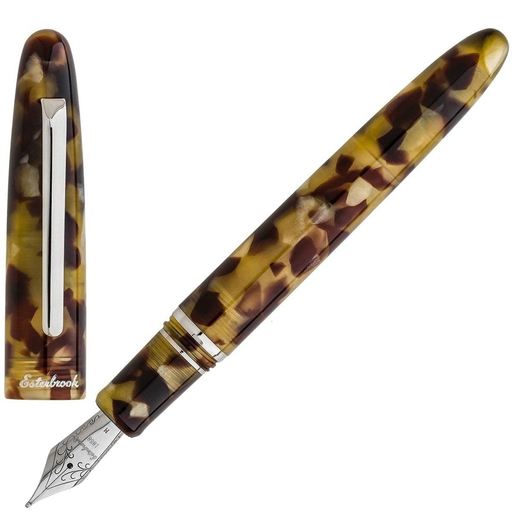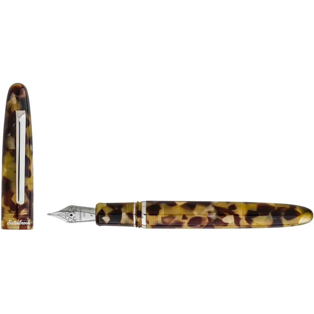 Der Esterbrook Estie Füllhalter in braun hat silberne Zierelemente und ein ungewöhnliches Design.