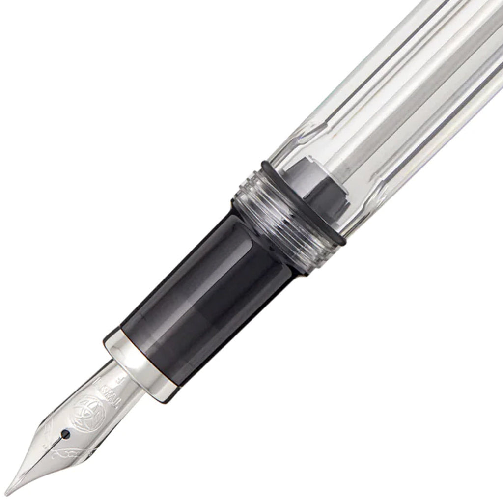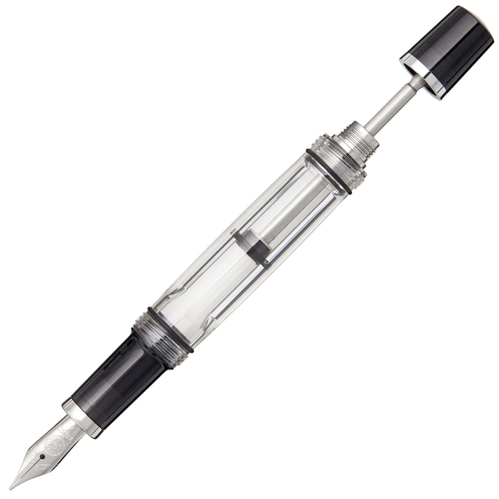 Der TWSBI VAC Mini Füllhalter hat silberne Zierelemente und ist ein sogenannter Demonstrator - ein Füllhalter mit durchsichtigem Korpus.