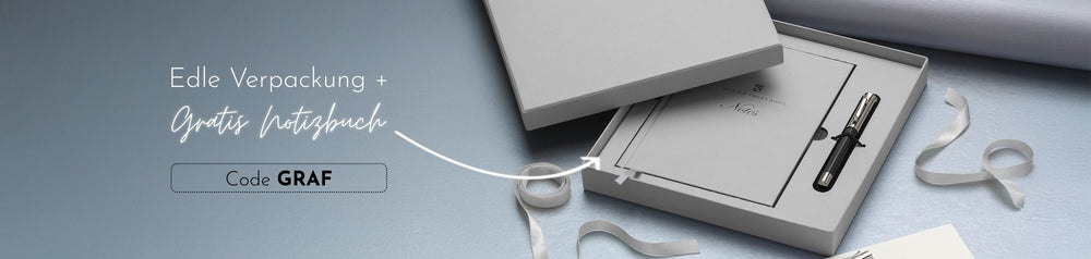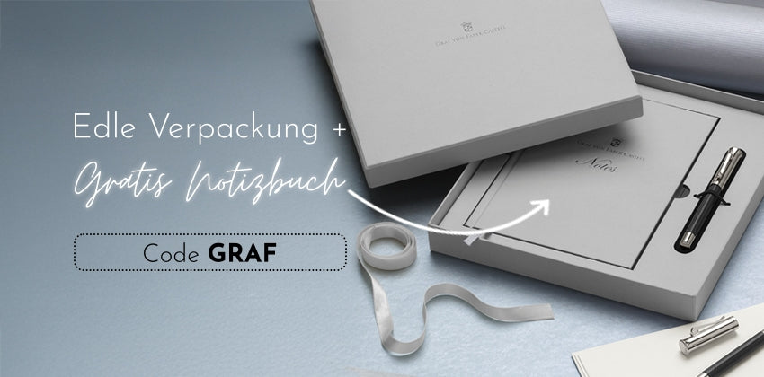Beim Kauf eines Graf von Faber-Castell Füllers, Kugelschreibers oder Rollerballs gibt’s eine edle Geschenkverpackung & ein gratis Notizbuch dazu mit Code: GRAF