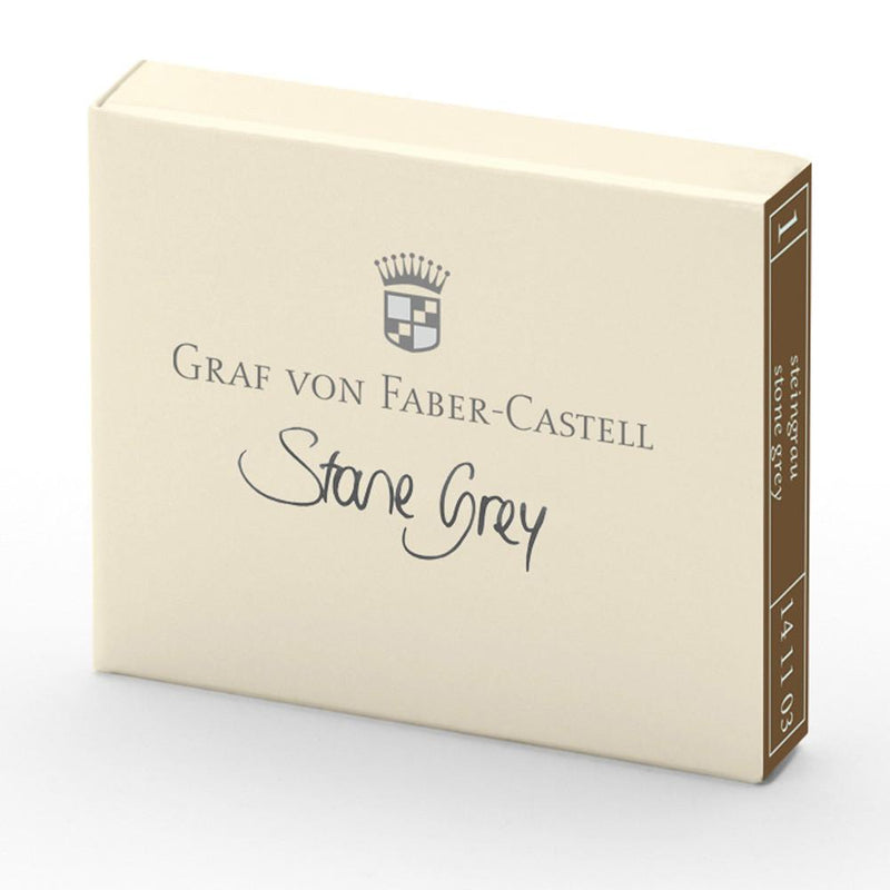 Graf von Faber-Castell Tintenpatronen - Die Tinte ist in einer Faltschachtel mit 6 Tintenpatronen erhältlich. Die Tinte zeichnet sich aus durch ihre einzigartige Rezeptur. Zudem ist diese Tinte wird ohne Partikel und Ruß hergestellt. Dies hat den Vorteil, dass der Tintenleiter nichtmehr verstopft. Ebenfalls hat die Tinte eine der höchsten Farbintensitäten und ist dokumentenecht. Der Endverbraucher kann zwischen vielen von der Natur inspirierten Farben: Carbon Black, Cobalt Blue, Hazelnut Brown, Stone Grey, Moss Green, Garnet Red, Midnight Blue, Deep Sea Green, Royal Blue, Electric Pink, Turquoise oder Burns Orange wählen. Sie zeichnen sich durch eine besondere Farbtiefe aus. Bis auf die Farbe Royal Blue, Cognac Brown und Electric Pink sind die Tinten dokumentenecht.