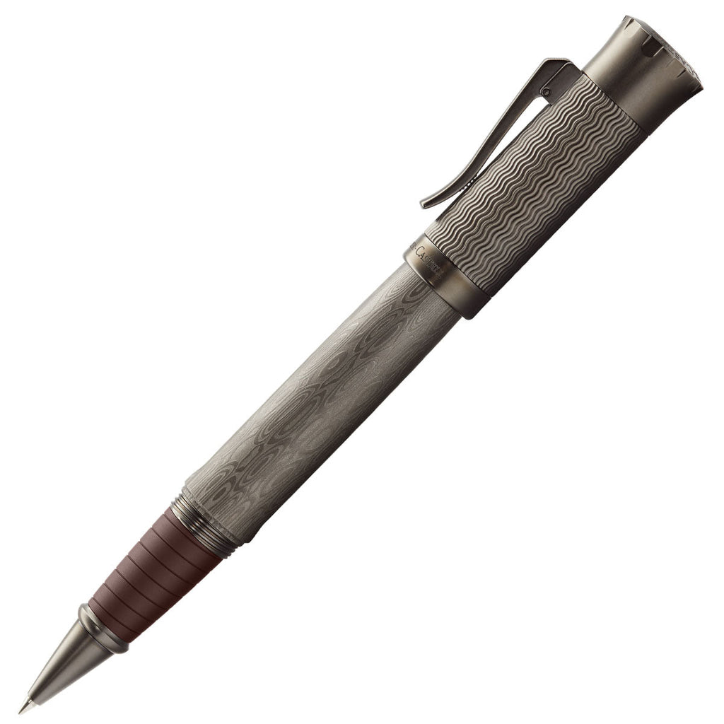 Der dunkelgraue Schaft des Tintenrollers, gefertigt aus hochwertigen Materialien, strahlt eine zeitlose Eleganz aus. Er ist mit präzisen metallischen Gravuren verziert, die an die aufwendigen Verzierungen mittelalterlicher Rüstungen erinnern. Der Drehmechanismus der Kappe unterstreicht die hochwertige Verarbeitung und ermöglicht einen reibungslosen Einsatz im Alltag.