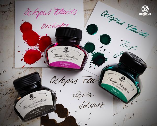 Gefertigt aus hochwertigen Inhaltsstoffen nach einer exklusiven Rezeptur, garantiert die Tinte eine minimale Fiederung und ein schnelles Trocknungsverhalten auf dem Papier, was ein sauberes und professionelles Schriftbild ermöglicht. Die Octopus Fluids Classic Tinte ist kompatibel mit Kolbenfüllhaltern, Konverterfüllern sowie Kalligrafie- und Glasfedern und eignet sich somit ideal für den täglichen Schriftverkehr, kreatives Journaling und kalligrafische Gestaltung.