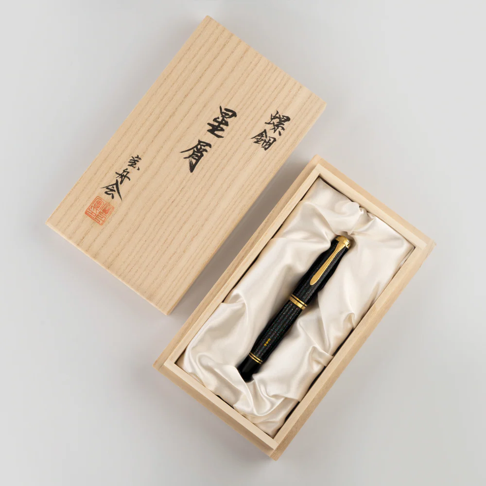 Die Oberfläche des Füllfederhalters ist mit tiefschwarzem Urushi-Lack veredelt, der die faszinierende Tiefe eines nächtlichen Sternenhimmels widerspiegelt. In aufwendiger Handarbeit werden feinste Partikel aus Abalone-Muschel kunstvoll eingearbeitet und erzeugen ein lebendiges, schimmerndes Farbspiel. Je nach Lichteinfall erscheinen irisierende Nuancen in Blau, Grün, Violett und Silber – wie funkelnder Sternenstaub auf dunklem Grund.