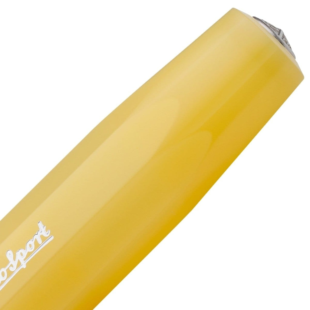 Der Kaweco Frosted Sport Rollerball in gelb wird mit silbernen Zierelementen vervollständigt und hat ein widerstandsfähiges Design.