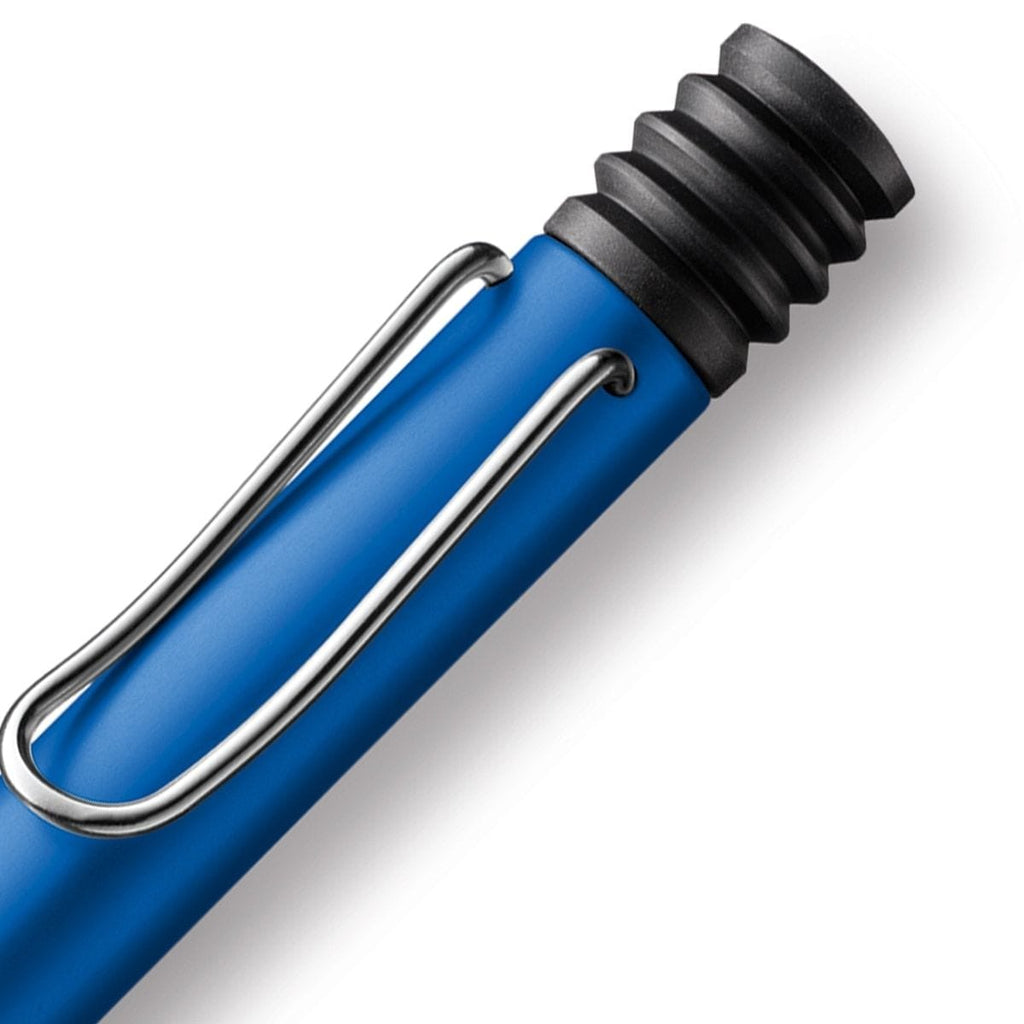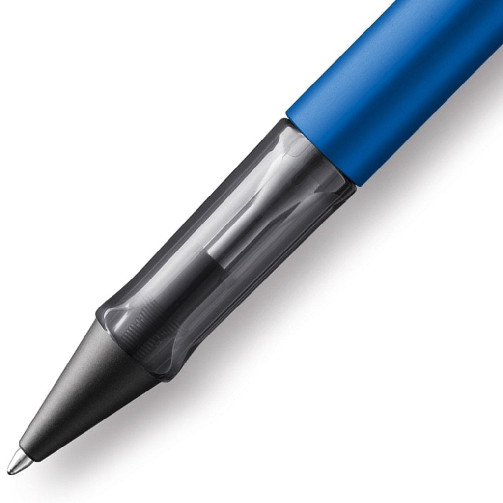Die blaue Farbe, silberne Zierelemente und ein Design im Bauhausstilsind Hauptmerkmale des Lamy AL-Star Kugelschreibers.