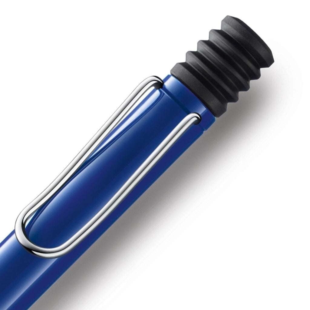 Die blaue Farbe, ergänzt durch silberne Zierelemente und einem Design im Bauhausstil: Das ist der Lamy Safari Kugelschreiber!