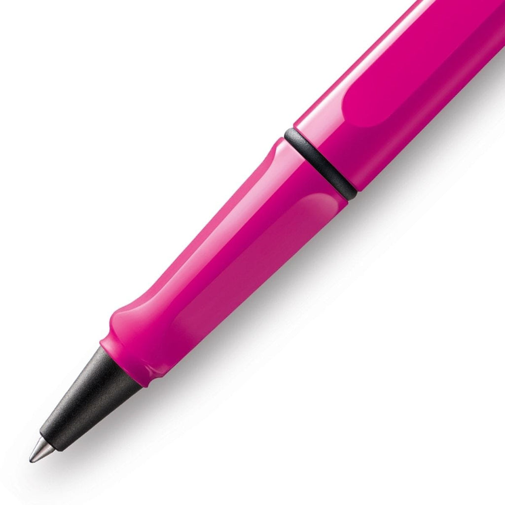 Die rosane Farbe, ergänzt durch silberne Zierelemente und einem Design im Bauhausstil: Das ist der Lamy Safari Tintenroller!