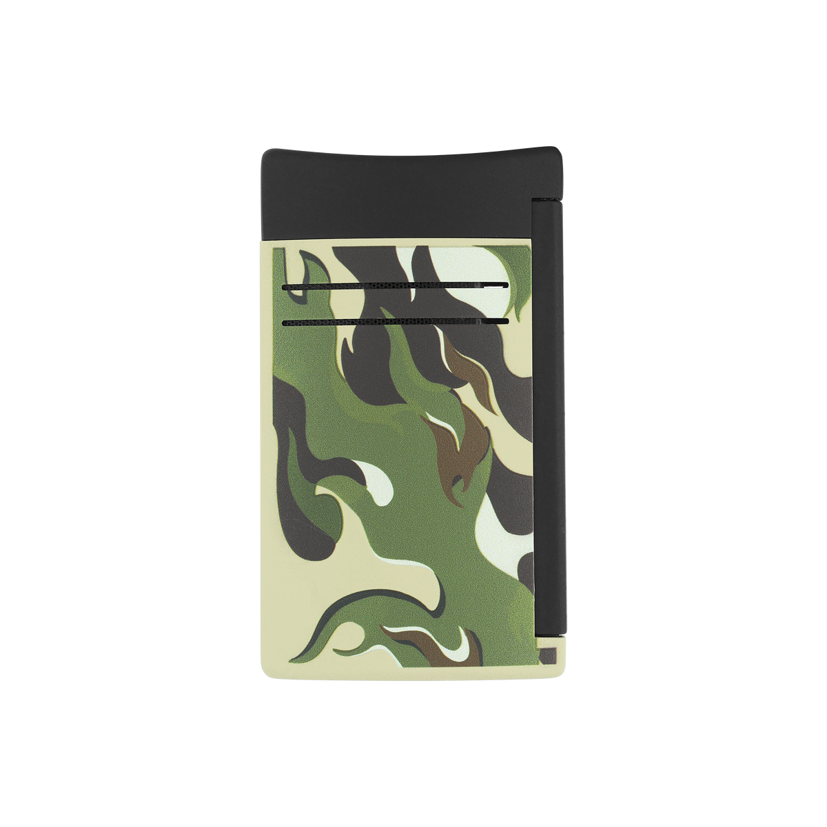 Das S.T. Dupont MaxiJet Camo Feuerzeug vereint modernes Design mit der bewährten Qualität der Marke. Der robuste Metallkorpus ist mit einer widerstandsfähigen, matten Lackierung versehen, die nicht nur langlebig ist, sondern auch eine angenehme Haptik bietet. Das markante Camouflage-Dekor verleiht dem Feuerzeug einen sportlich-urbanen Look, der durch das dezente Branding von S.T. Dupont abgerundet wird.