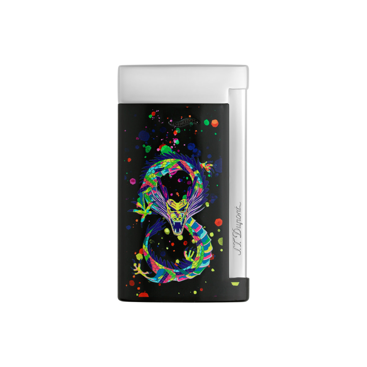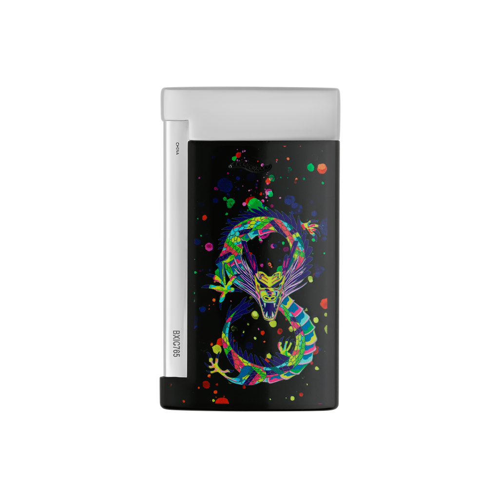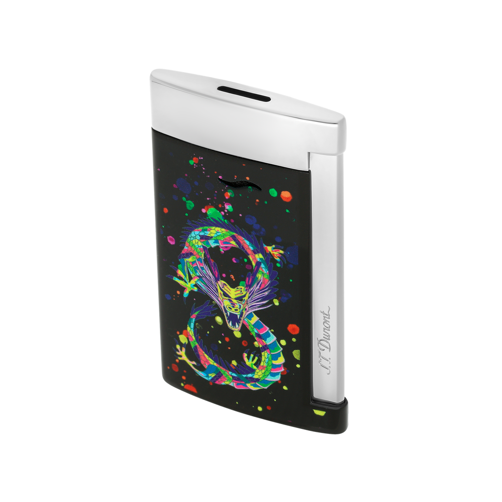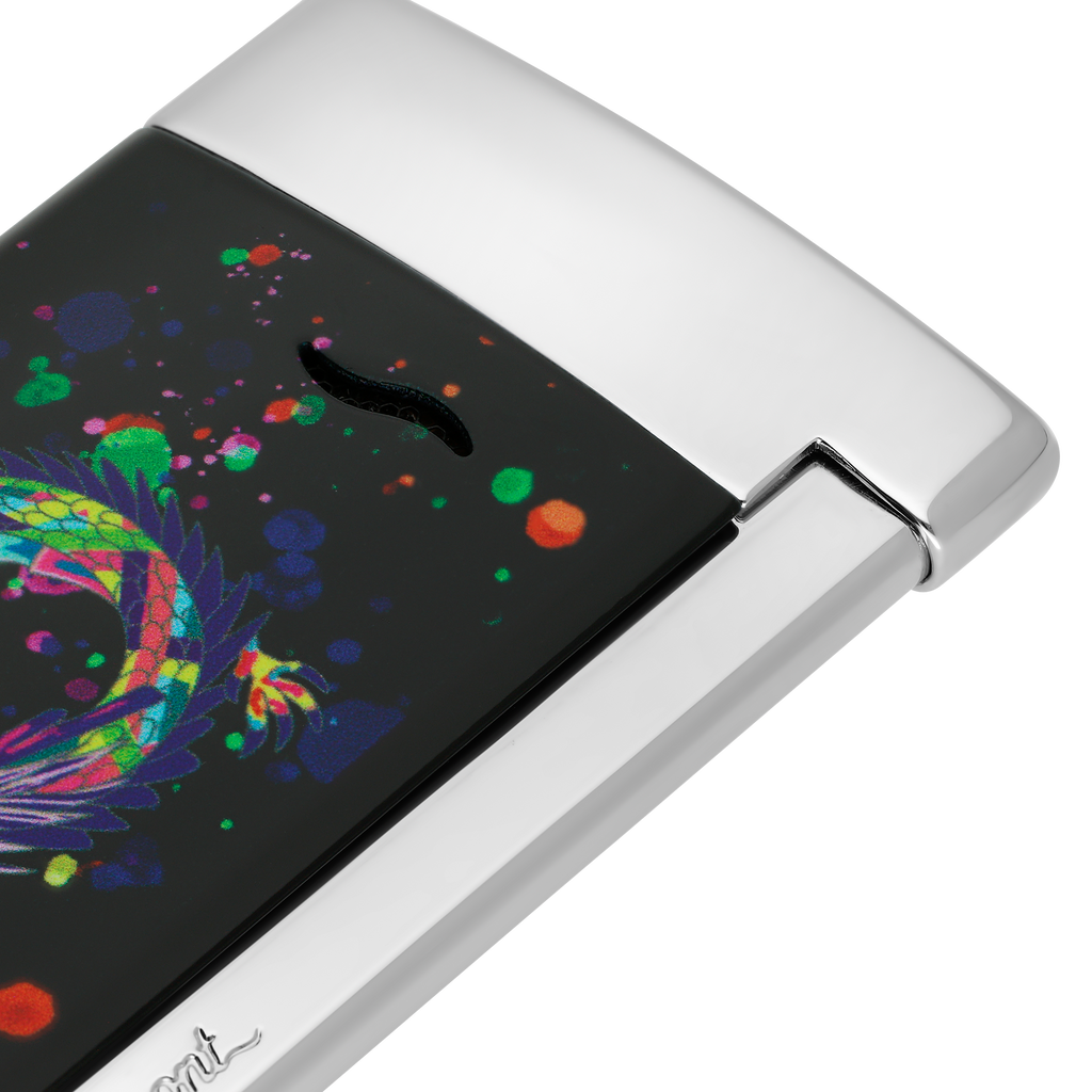 Der S.T. Dupont Slim 7 ist ein Meisterwerk der Eleganz und Funktionalität. Mit seinem ultraflachen Profil von nur 7 mm und einem Gewicht von 45 g ist es eines der schlanksten Luxusfeuerzeuge seiner Klasse. Die Kombination aus glänzendem schwarzem Lack und verchromten Akzenten verleiht ihm eine zeitlose Ästhetik, während das detaillierte Drachenmotiv einen fernöstlichen Akzent setzt.