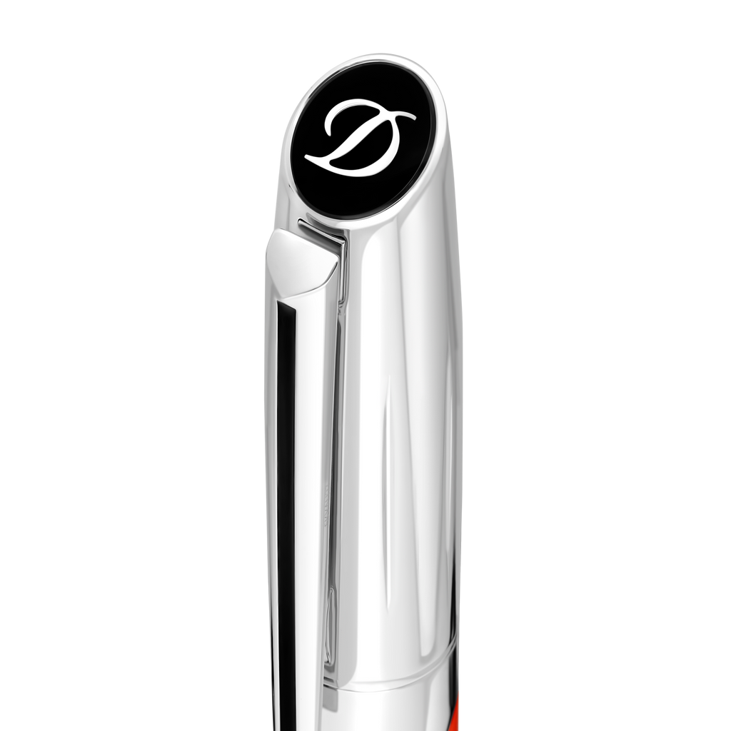 Der S.T. Dupont Défi Füllfederhalter verkörpert die perfekte Symbiose aus modernem Design und traditioneller Handwerkskunst. Mit seinem sportlich-modernen „Chassis“-Design und der markanten roten Hochglanz-Lackierung zieht er alle Blicke auf sich. Die polierten Metallakzente im Chrom-/Palladium-Finish verleihen dem Füllfederhalter eine elegante Note, die die präzise französische Metallverarbeitung von S.T. Dupont unterstreicht.