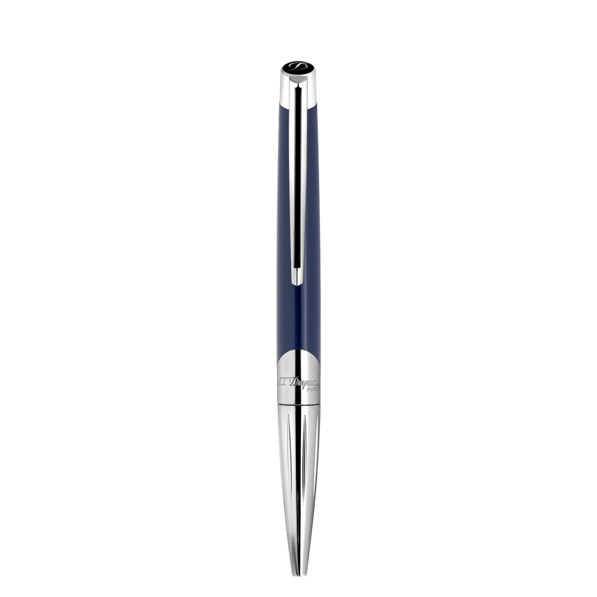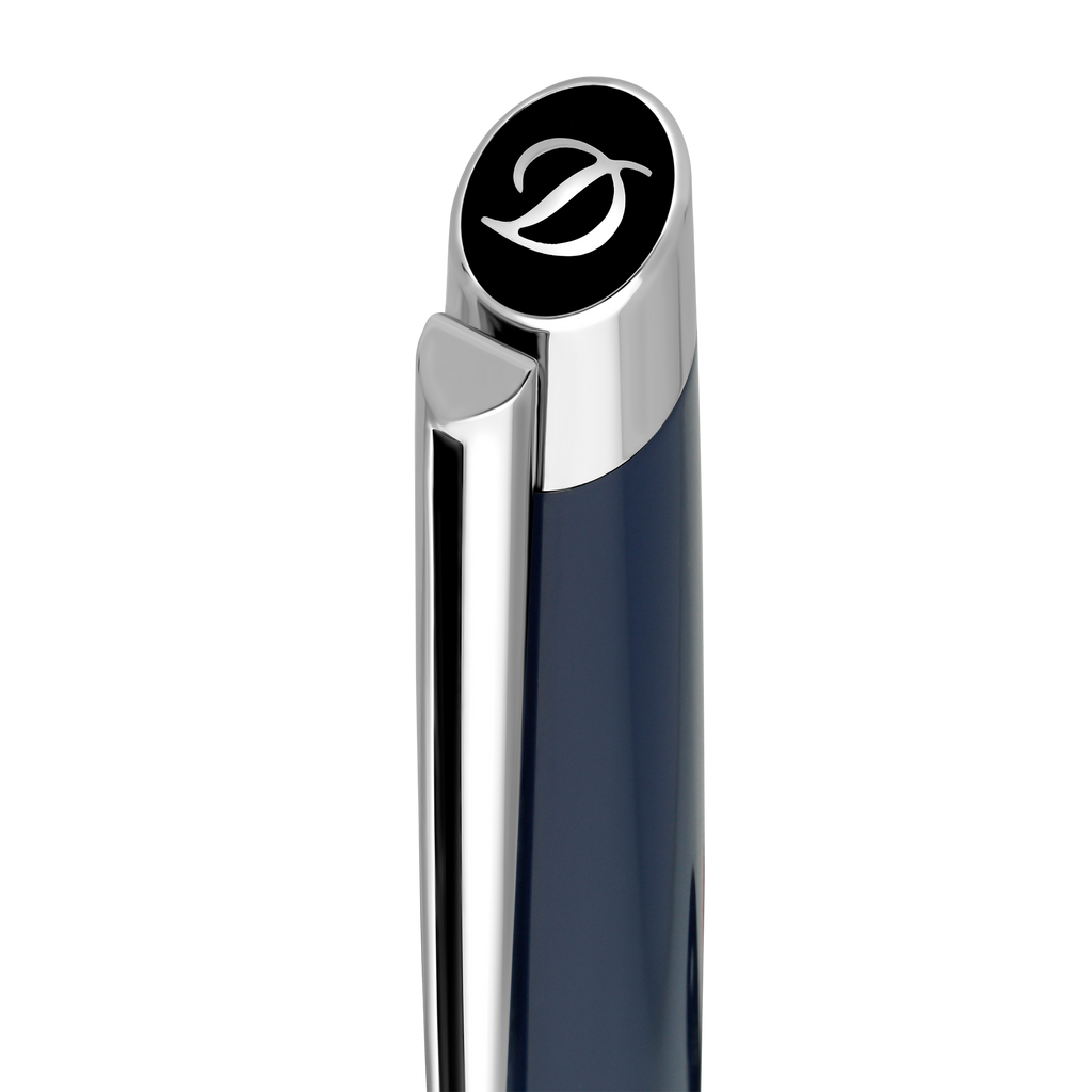 Der S.T. Dupont Kugelschreiber vereint französische Luxusqualität mit zeitloser Eleganz. Die tiefblaue, hochglänzende Lackoberfläche harmoniert perfekt mit den silberfarbenen Metallakzenten, die für einen langlebigen Glanz sorgen. Der federnde Metallclip und der sanft konische Körper bieten eine ausgewogene Haptik, die das Schreiben zum Vergnügen macht.