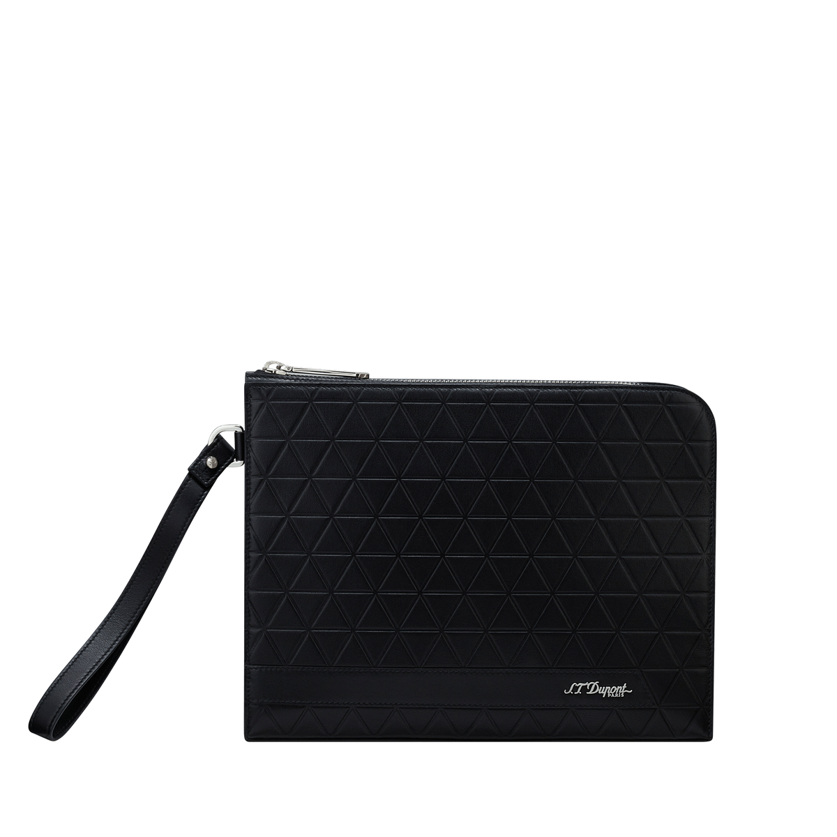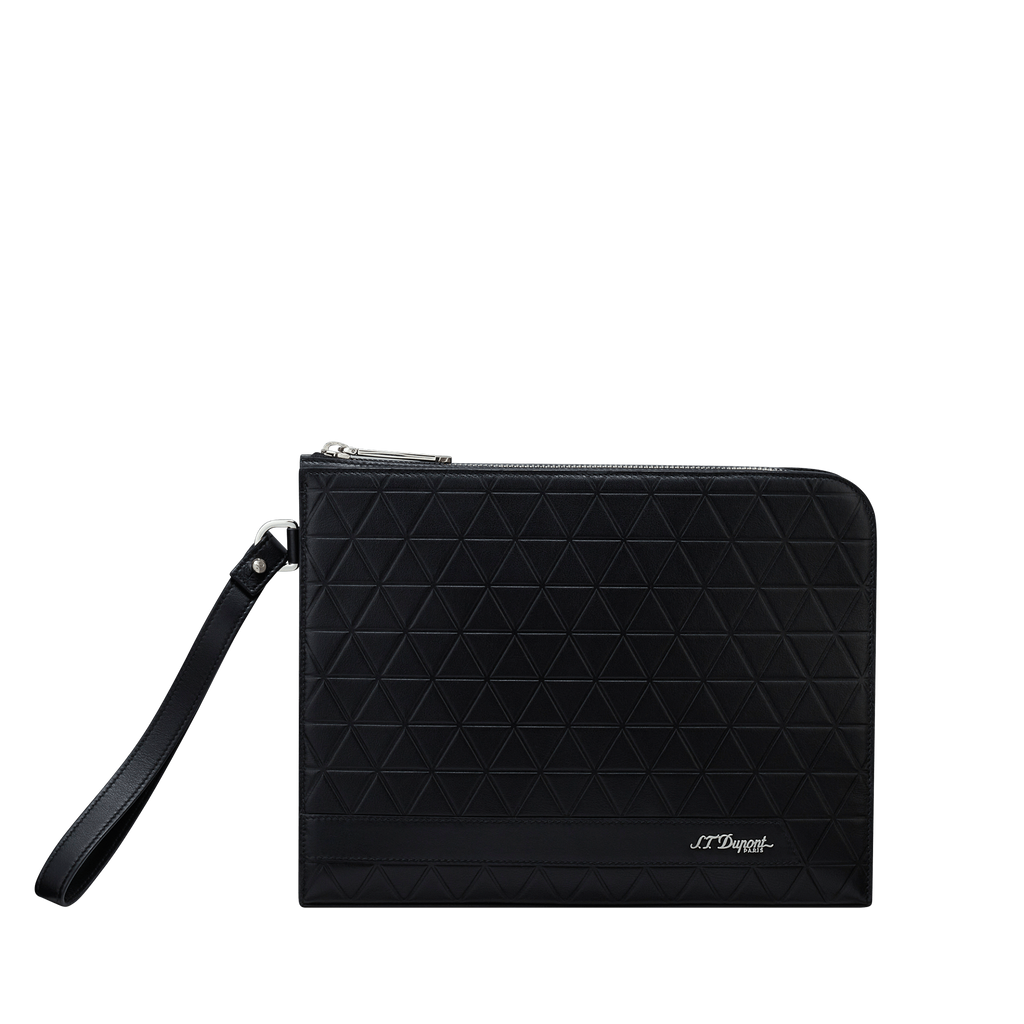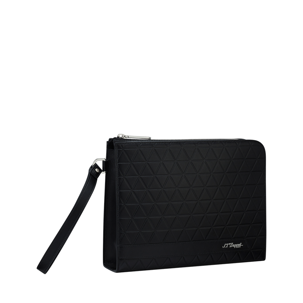 Die S.T. Dupont Firehead Pochette in tiefem Schwarz ist ein Meisterwerk der Handwerkskunst, das die ikonische Firehead-Prägung in die Welt der Lederwaren überträgt. Diese strukturierte Oberfläche, inspiriert vom rautenförmigen Muster der legendären S.T. Dupont-Feuerzeuge, verleiht dem Leder eine elegante und griffige Haptik.