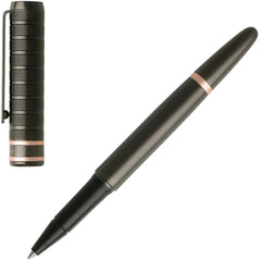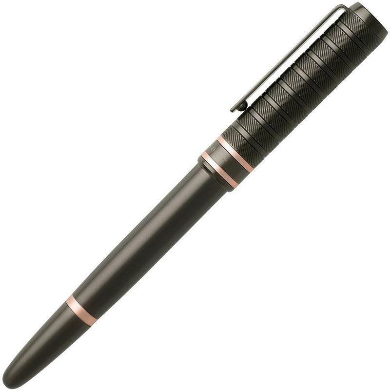Der Tintenroller aus der Hugo Boss Level Soft Structure Kollektion erscheint im modernen und wohl durchdachten Design. Der Schaft besteht aus Messing und wird mit einer glatten Beschichtung aus Gunmetal veredelt. Die Kappe besitzt ein geriffeltes, strukturiertes Muster und spiegelt gekrönt von rosegoldenen Zierelementen das Markenlogo von Hugo Boss. Das toll geformte Griffstück ermöglicht einen bequemen und angenehmen Schreibkomfort.