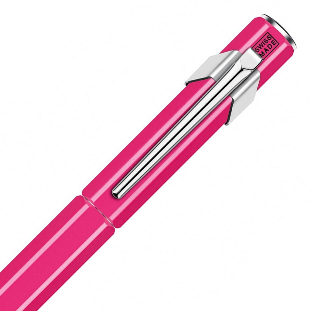 Die lilane Farbe, ergänzt durch silberne Zierelemente, ausgestattet mit einer Edelstahlfeder: Das ist der Caran d'Ache 849 Metall Füllhalter!