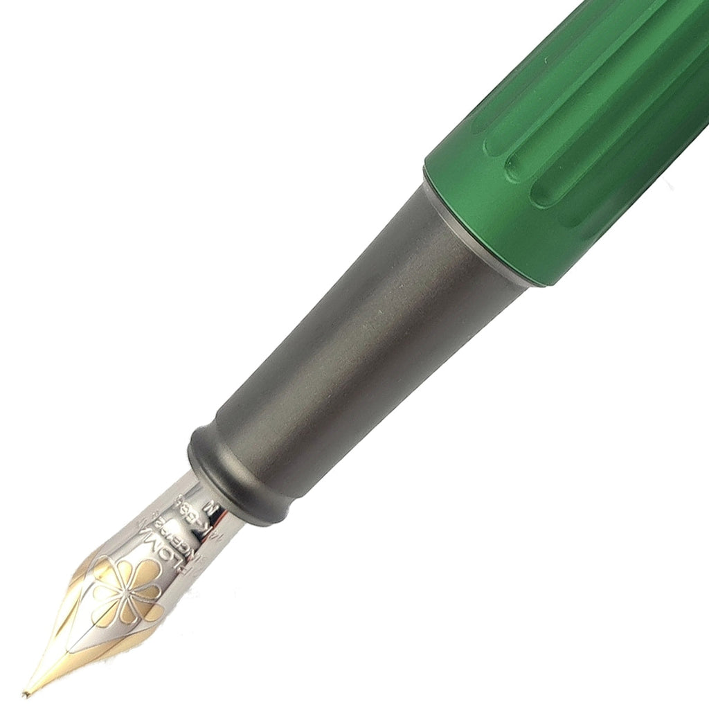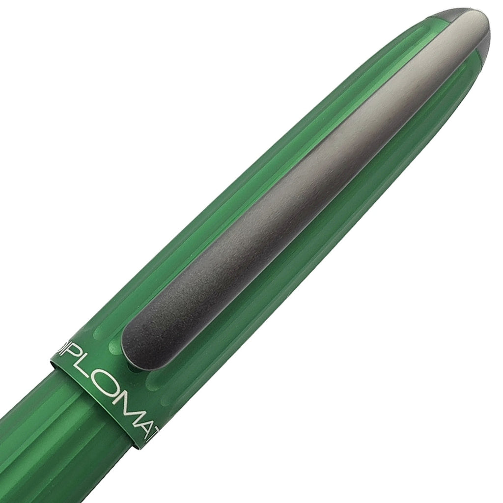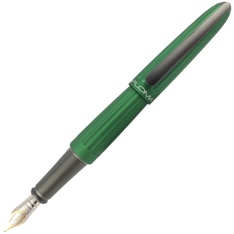 Die grüne Farbe, gunmetalfarbene Zierelemente und eine 14 Karat Goldfeder sind Hauptmerkmale des Diplomat Aero Füllfederhalters.