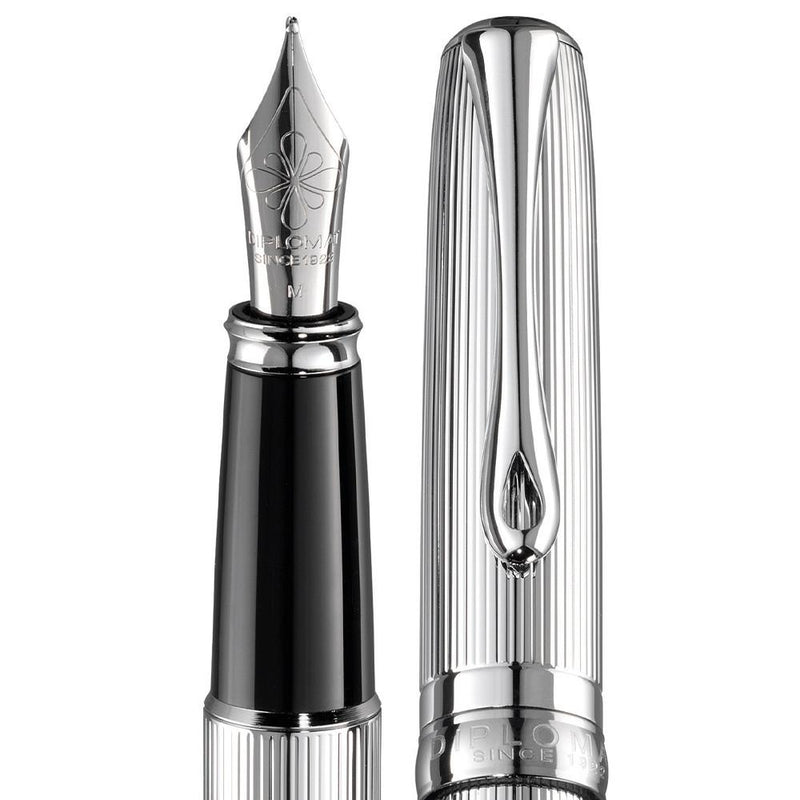 Die chromfarbene Farbe, ergänzt durch silberne Zierelemente, ausgestattet mit einer Edelstahlfeder: Das ist der Diplomat Excellence A2 Füllfederhalter!