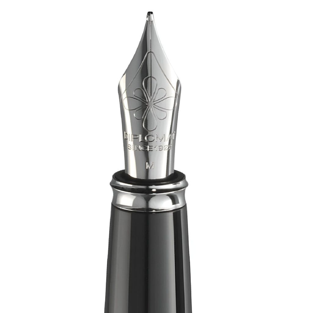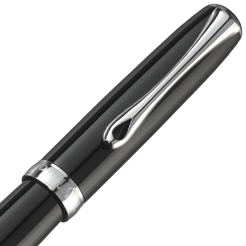 Die schwarze Farbe, silberne Zierelemente und eine Edelstahlfeder sind Hauptmerkmale des Diplomat Excellence A2 Füllers.