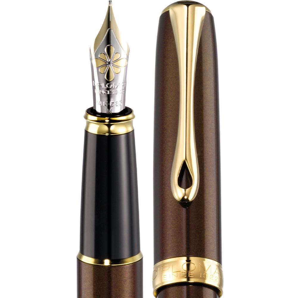 Die braune Farbe, vergoldete Zierelemente und eine 14 Karat Goldfeder sind Hauptmerkmale des Diplomat Excellence A2 Füllhalters.