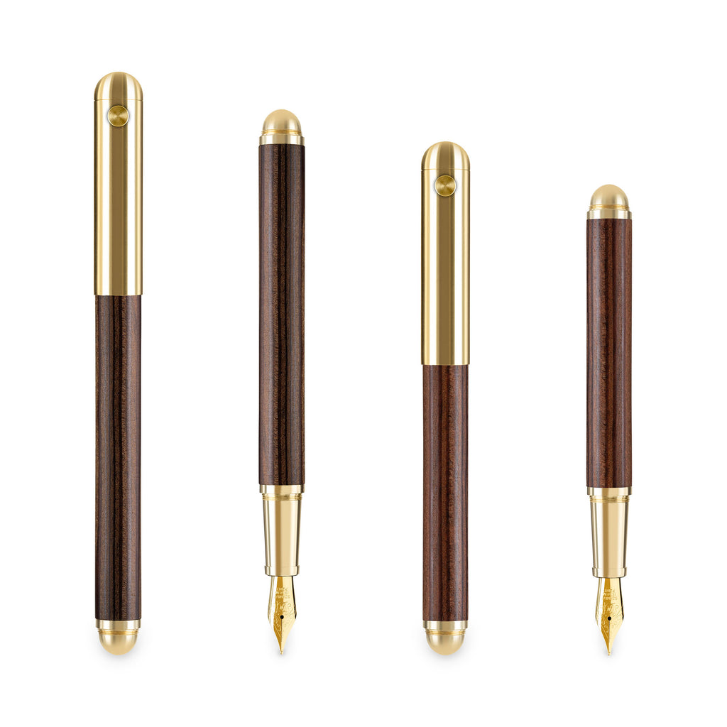 Der e+m CONTRACT LARCH Füllfederhalter vereint die natürliche Schönheit von geräuchertem Lärchenholz mit der robusten Eleganz von rohem Messing. Diese exquisite Kombination verleiht dem Schreibgerät eine warme Haptik und eine charaktervolle Maserung, die durch die Rauchbehandlung des Holzes noch verstärkt wird.