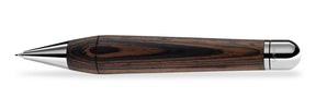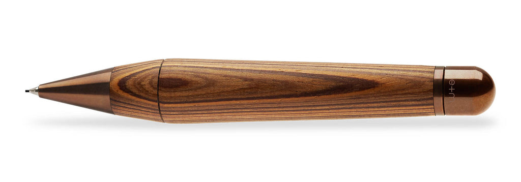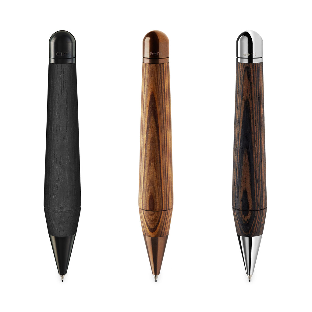 Der DRAKE Drehbleistift von e+m Holzprodukte GmbH vereint traditionelles Handwerk mit modernem Design. Gefertigt aus edlem Massivholz wie Zebrano und Blackwood, besticht er durch seine kantige Kontur und den markanten Halbkugelabschluss. Die präzise Messing-Drehmechanik sorgt für ein angenehmes Schreibgefühl.