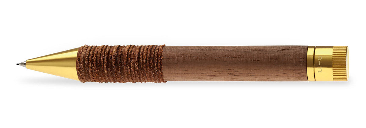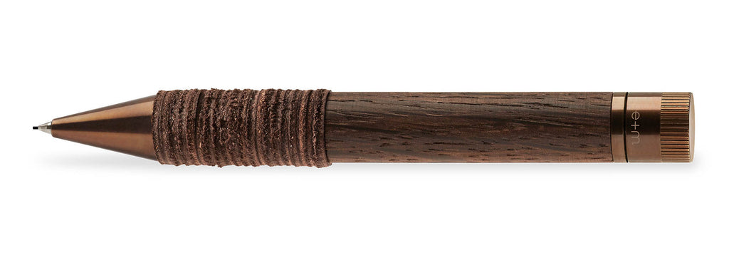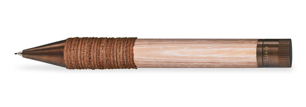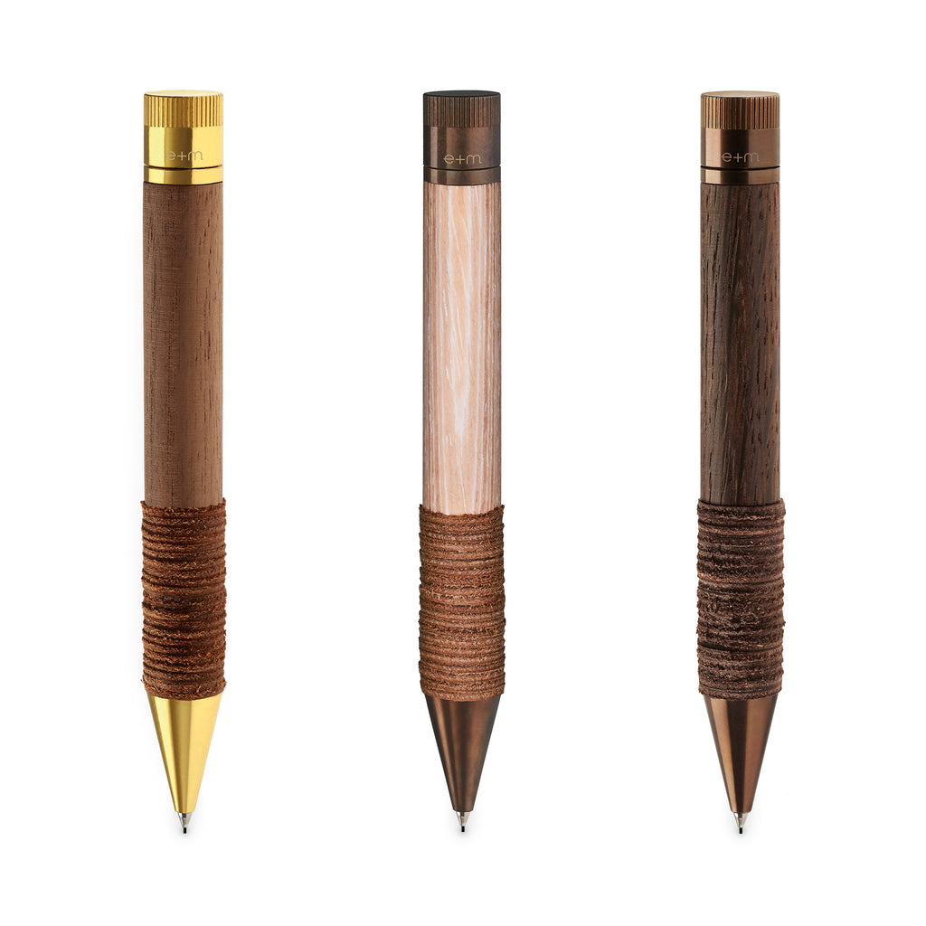 Der Drehbleistift MELANGE von e+m Holzprodukte GmbH vereint die Schönheit von massivem Holz mit der Eleganz einer lederummantelten Griffzone. Wählen Sie zwischen den edlen Holzarten Eiche, Walnuss und Ahorn, die jeweils durch eine präzise Messing-Mechanik ergänzt werden.