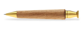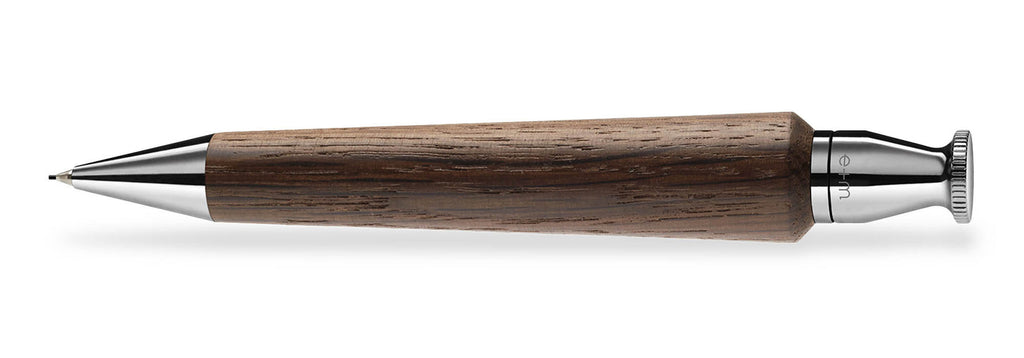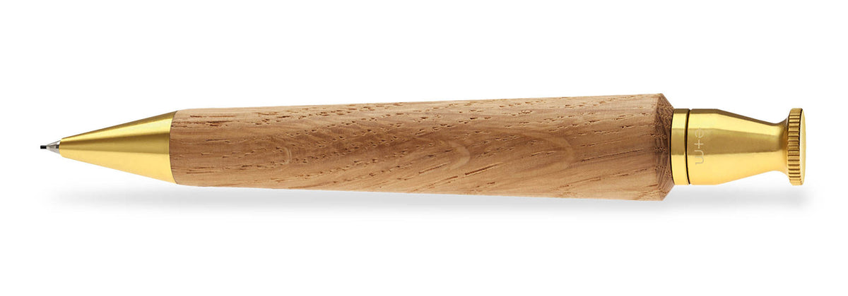 Der QUEEN Drehbleistift von e+m holzprodukte verkörpert die perfekte Symbiose aus traditionellem Handwerk und modernem Design. Gefertigt aus massivem Eichenholz, wahlweise in natur oder geräuchert, kombiniert er die Wärme des Holzes mit der kühlen Eleganz von Messing.