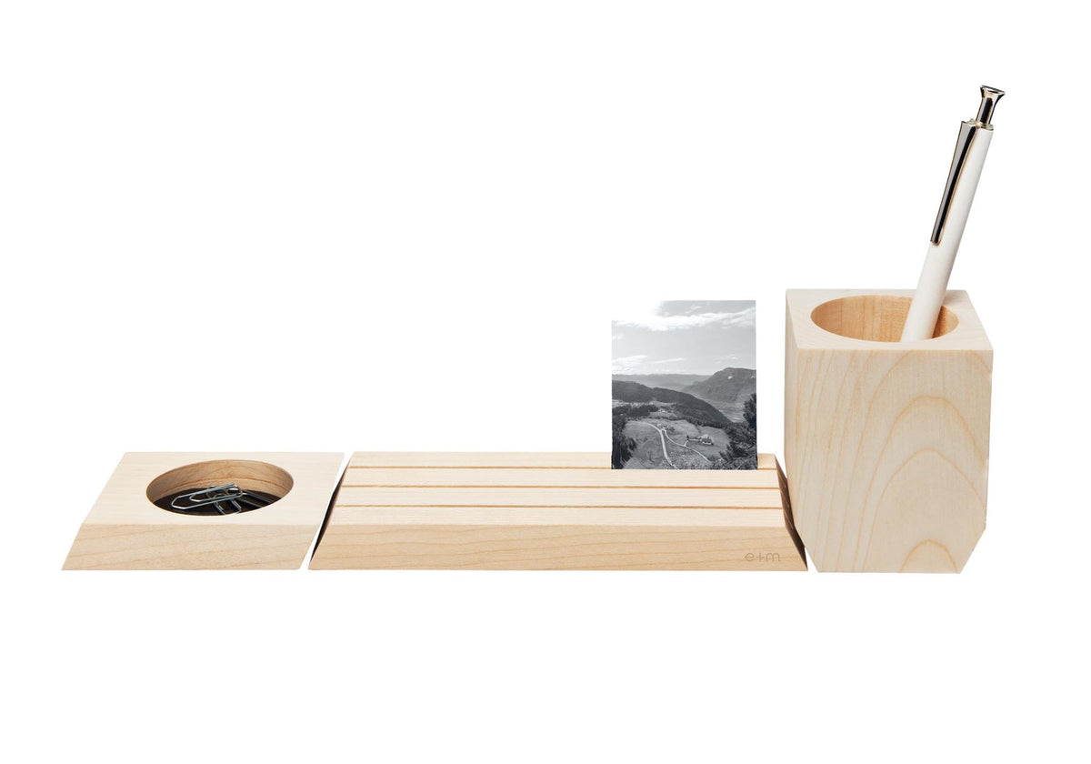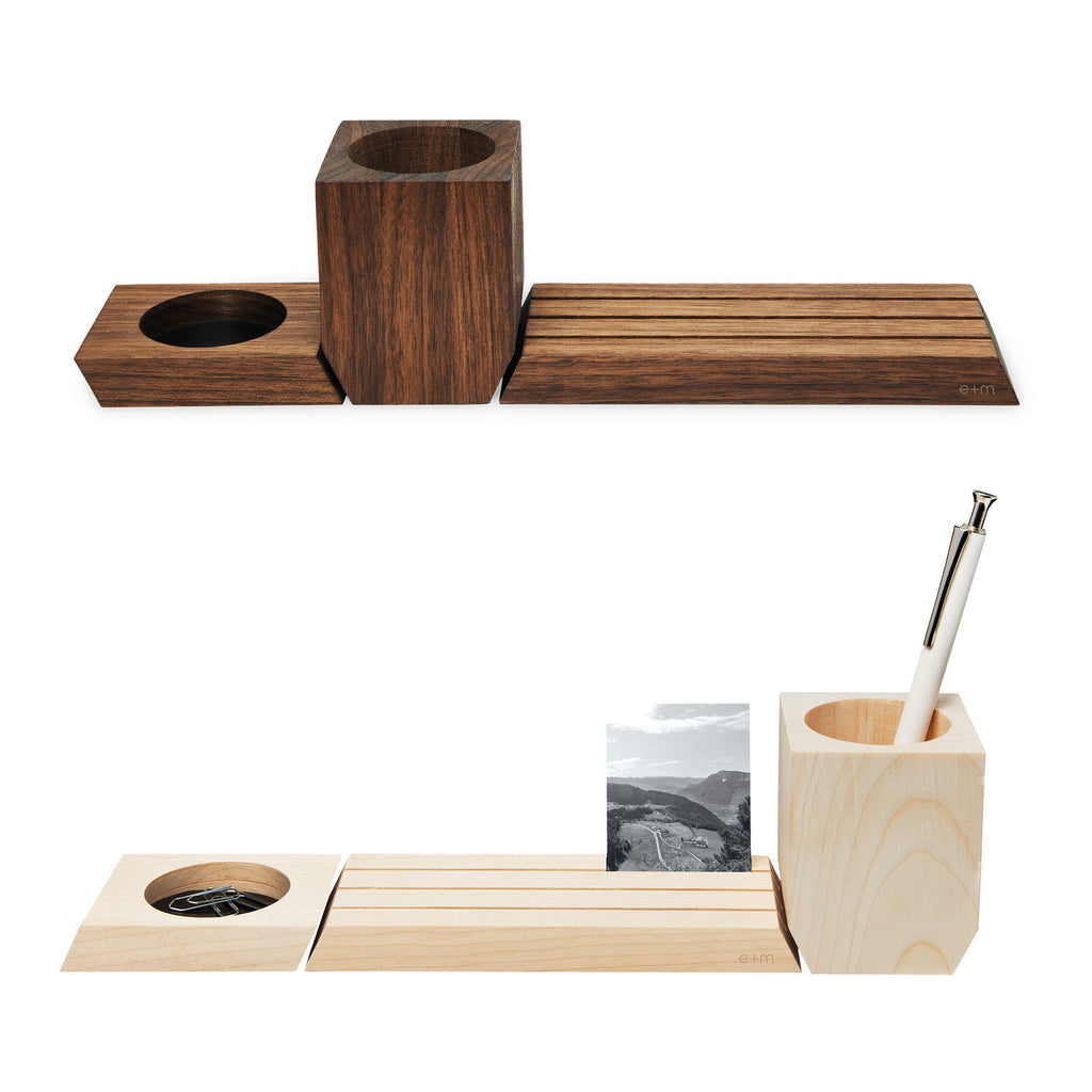 Dieses harmonische Set, bestehend aus einem Stiftebecher, einem Bilderhalter und einer Schreibschale, bietet flexible Einsatzmöglichkeiten – ob kompakt arrangiert oder als individuelle Solitäre. Die Nominierung für den Deutschen Nachhaltigkeitspreis 2021 unterstreicht den verantwortungsvollen Designanspruch. Ideal für stilvolle Arbeitsplätze und als personalisierbares Geschenk.