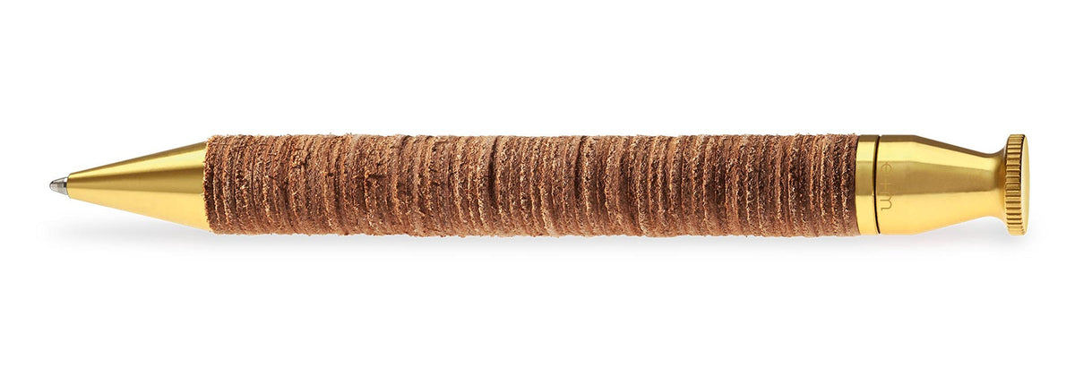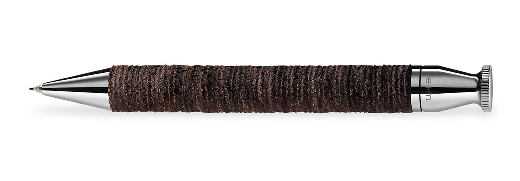 Der Drehbleistift von e+m Holzprodukte vereint traditionelles Handwerk mit modernem Design. Der Schaft ist mit mineralgegerbtem Leder ummantelt, das eine markante Haptik bietet und im Laufe der Zeit eine einzigartige Patina entwickelt. Die solide Messingmechanik sorgt für eine langlebige und zuverlässige Funktion.