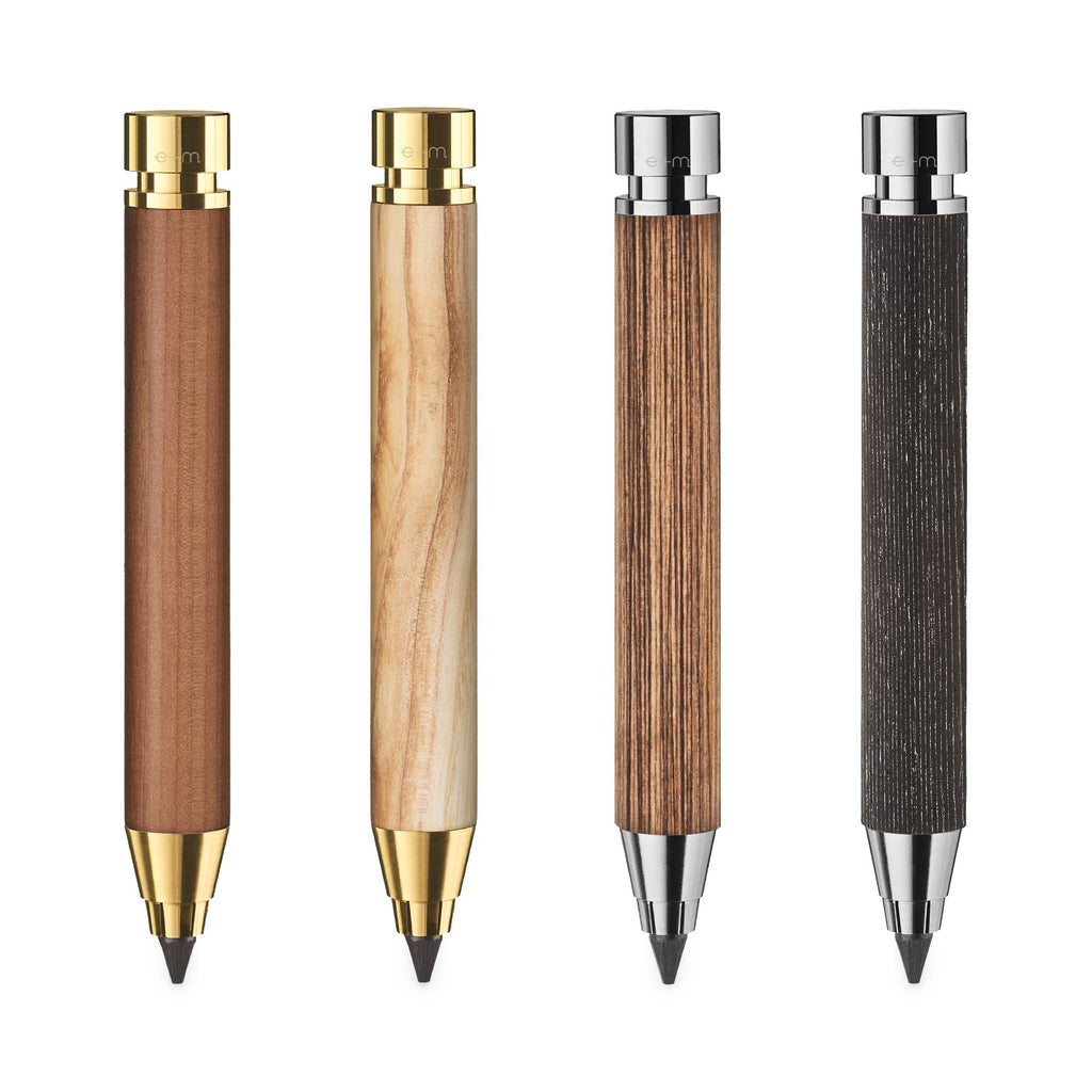 Die GRAPHIC-Serie von e+m Holzprodukte GmbH verkörpert die perfekte Symbiose aus edlen Massivhölzern und präziser Messing-Mechanik. Wählen Sie zwischen den Hölzern Esche, Birnbaum und Walnuss, die entweder naturbelassen oder gemasert veredelt sind. Die Metallkomponenten sind in Messing roh oder vernickelt erhältlich, was dem Stift eine zeitlose Eleganz verleiht.