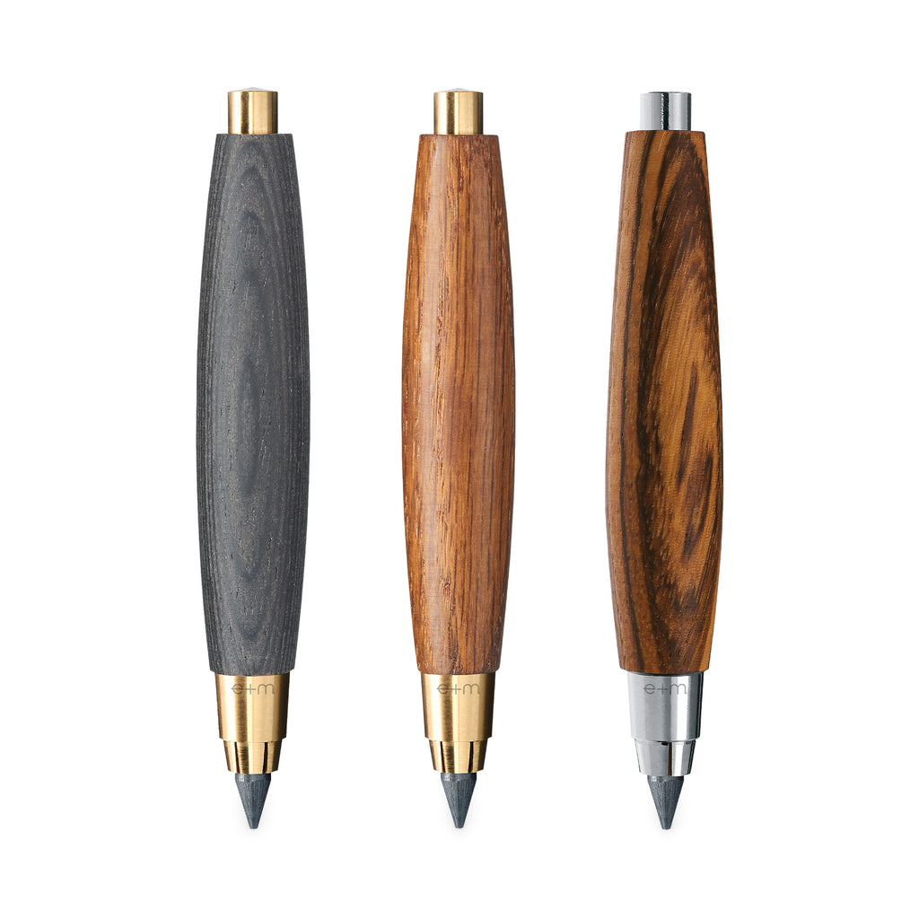 Der e+m SKETCH Fallminenstift vereint traditionelle Handwerkskunst mit modernem Design. Gefertigt aus massivem Holz, wahlweise Eiche oder Zebrano, und kombiniert mit einer robusten Messing-Mechanik, bietet dieser Stift eine natürliche Haptik und Langlebigkeit.