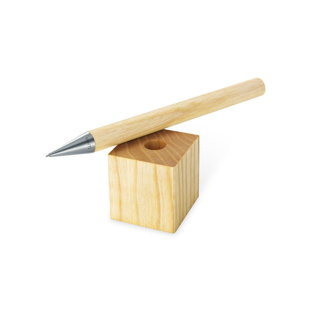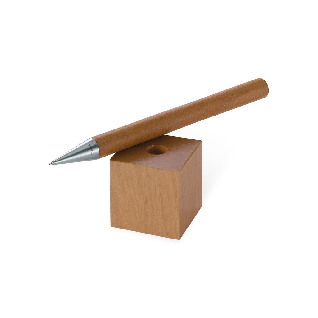 Gefertigt aus massivem Holz, stehen die Varianten Wildkirsche, Esche und Buche zur Auswahl, wobei die ersten beiden FSC®-zertifiziert sind. Der Stift wird durch einen würfelförmigen Stifthalter ergänzt, der eine aufrechte Präsentation auf dem Schreibtisch ermöglicht.