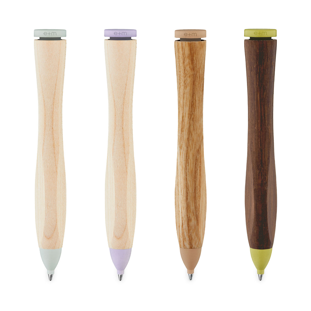 Der SWING Kugelschreiber von e+m Holzprodukte GmbH vereint die natürliche Schönheit von Massivholz mit der Eleganz einer lackierten Messing-Mechanik. Erhältlich in den edlen Holzarten Ahorn, Esche und Walnuss, bietet er eine harmonische Kombination aus natürlichen Materialien und modernen Farbakzenten.