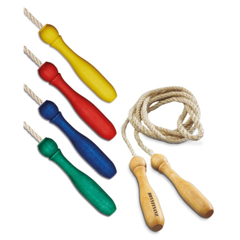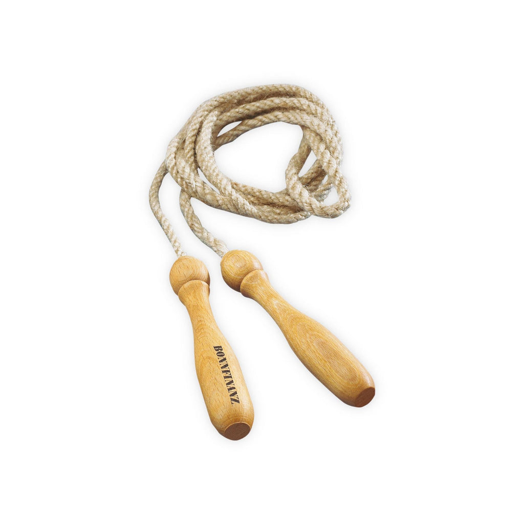 Das JUMPING JACK Springseil von e+m Holzprodukte GmbH vereint traditionelles Handwerk mit modernen Ansprüchen. Die Griffe aus FSC®-zertifiziertem Buchenholz bieten eine robuste und langlebige Haptik, die durch das mittig verstärkte Juteseil ergänzt wird. Diese Kombination sorgt für ein ausgewogenes und komfortables Springvergnügen.