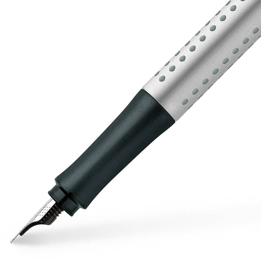 Mit seinem aufmerksamen Design ist der Faber-Castell Grip Füller in silbern genau das Richtige für Schreibanfänger. Silberne Zierelemente und eine besoders robuste Edelstahlfeder komplettieren dabei den Füllfederhalter.