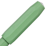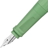Die grüne Farbe, silberne Zierelemente und eine Edelstahlfeder sind Hauptmerkmale des Kaweco Perkeo Füllfederhalters.