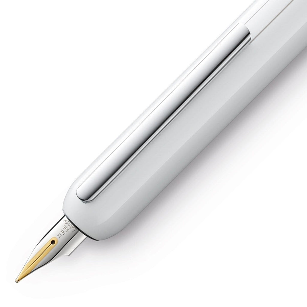 Die weiße Farbe, silberne Zierelemente und eine 14 Karat Goldfeder sind Hauptmerkmale des Lamy Dialog Füllhalters.
