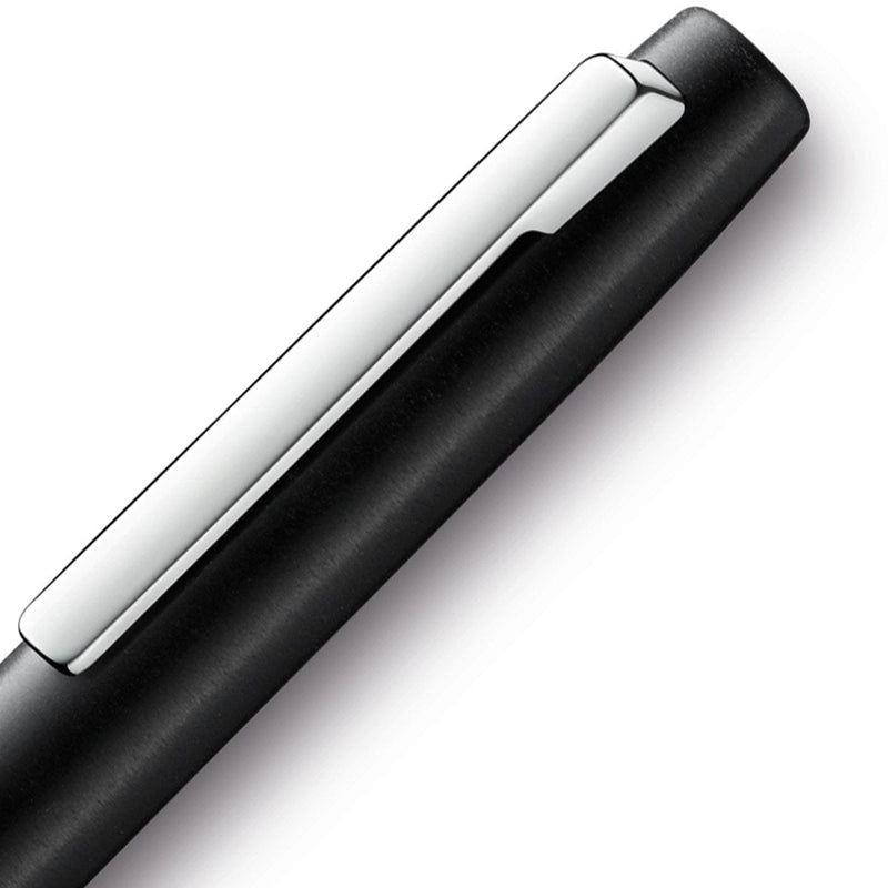 Die schwarze Farbe, ergänzt durch silberne Zierelemente und einem Design im Bauhausstil: Das ist der Lamy aion Kugelschreiber!