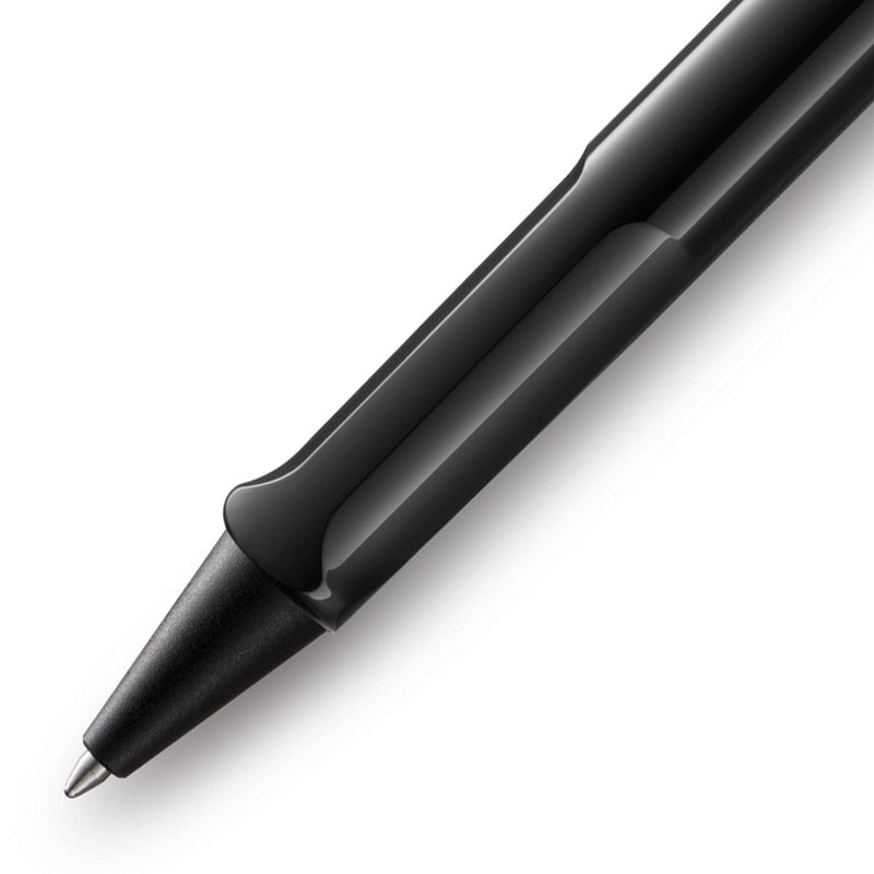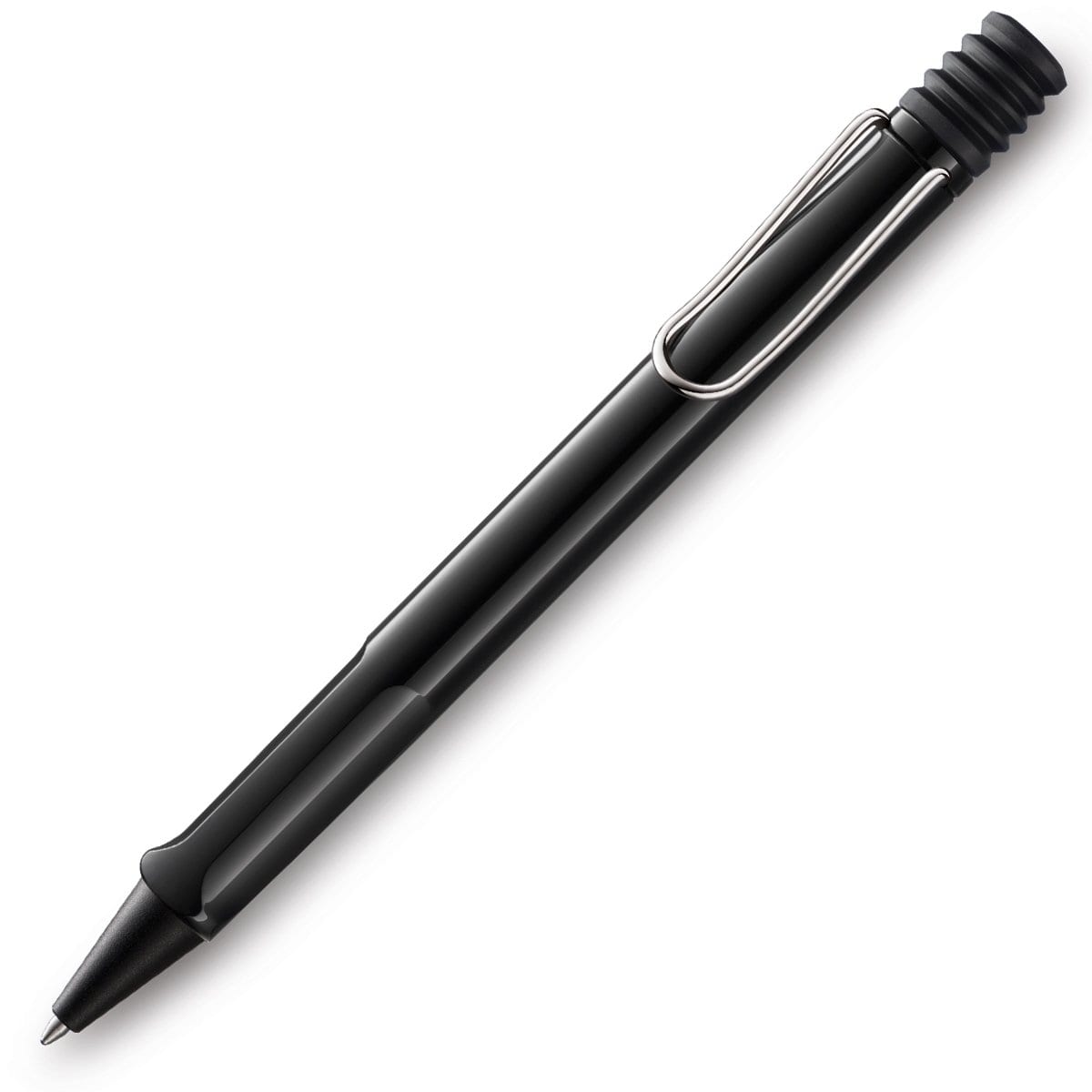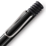 Der Lamy Safari Kugelschreiber in schwarz wird mit silbernen Zierelementen vervollständigt und hat ein Design im Bauhausstil.