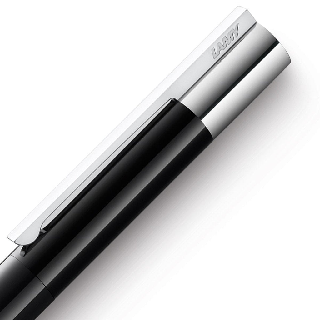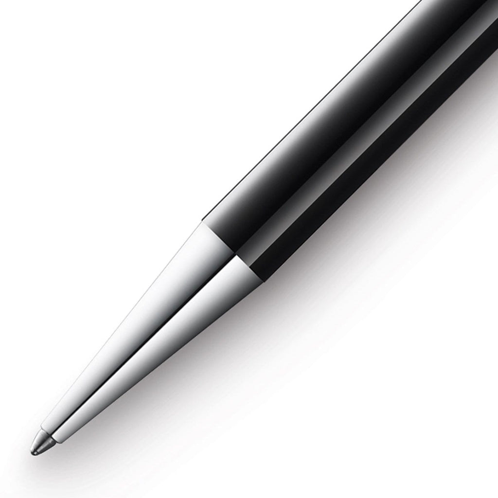 Der Lamy Scala Kugelschreiber in schwarz wird mit silbernen Zierelementen vervollständigt und hat ein Design im Bauhausstil.