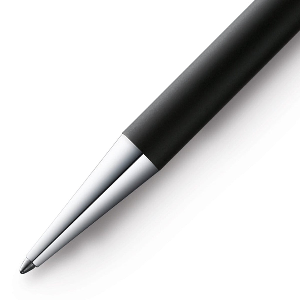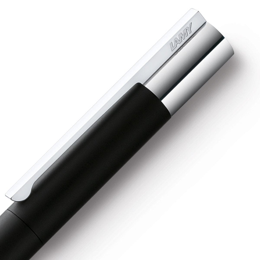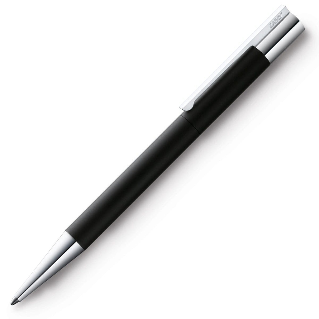 Der Lamy Scala Kugelschreiber in schwarz wird mit silbernen Zierelementen vervollständigt und hat ein Design im Bauhausstil.