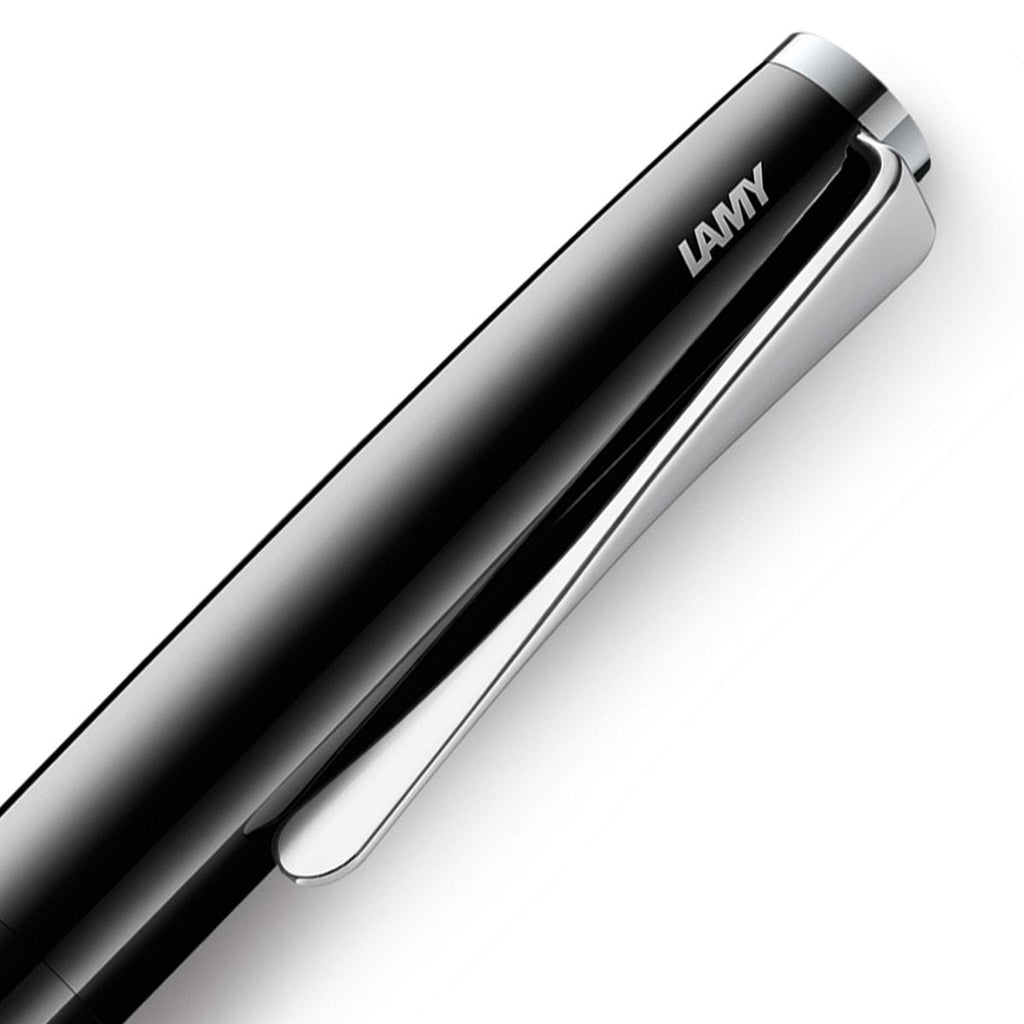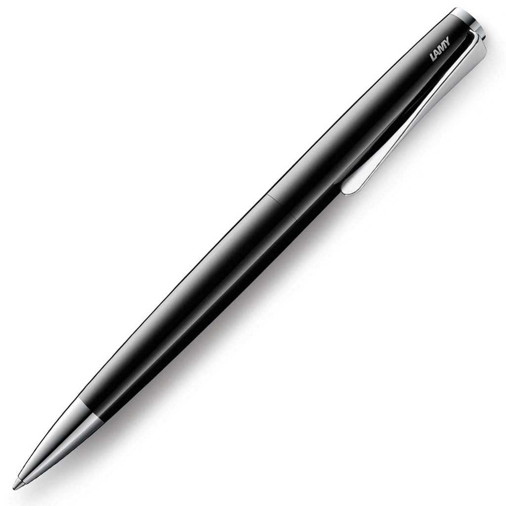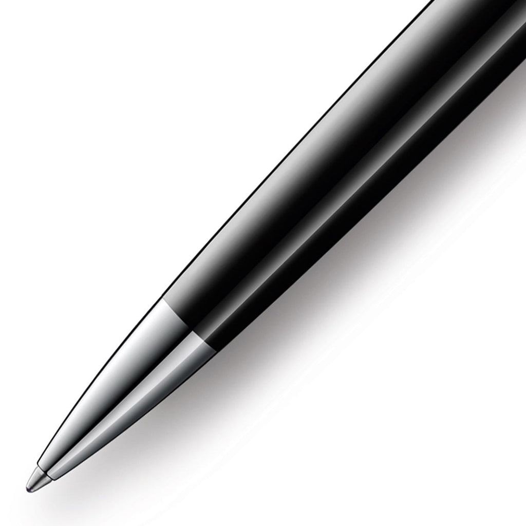 Der Lamy Studio Kugelschreiber in schwarz wird mit silbernen Zierelementen vervollständigt und hat ein Design im Bauhausstil.