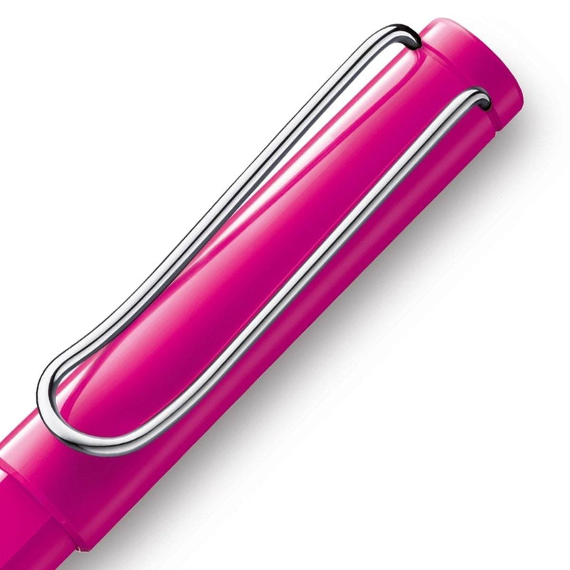 Die rosane Farbe, ergänzt durch silberne Zierelemente und einem Design im Bauhausstil: Das ist der Lamy Safari Tintenroller!