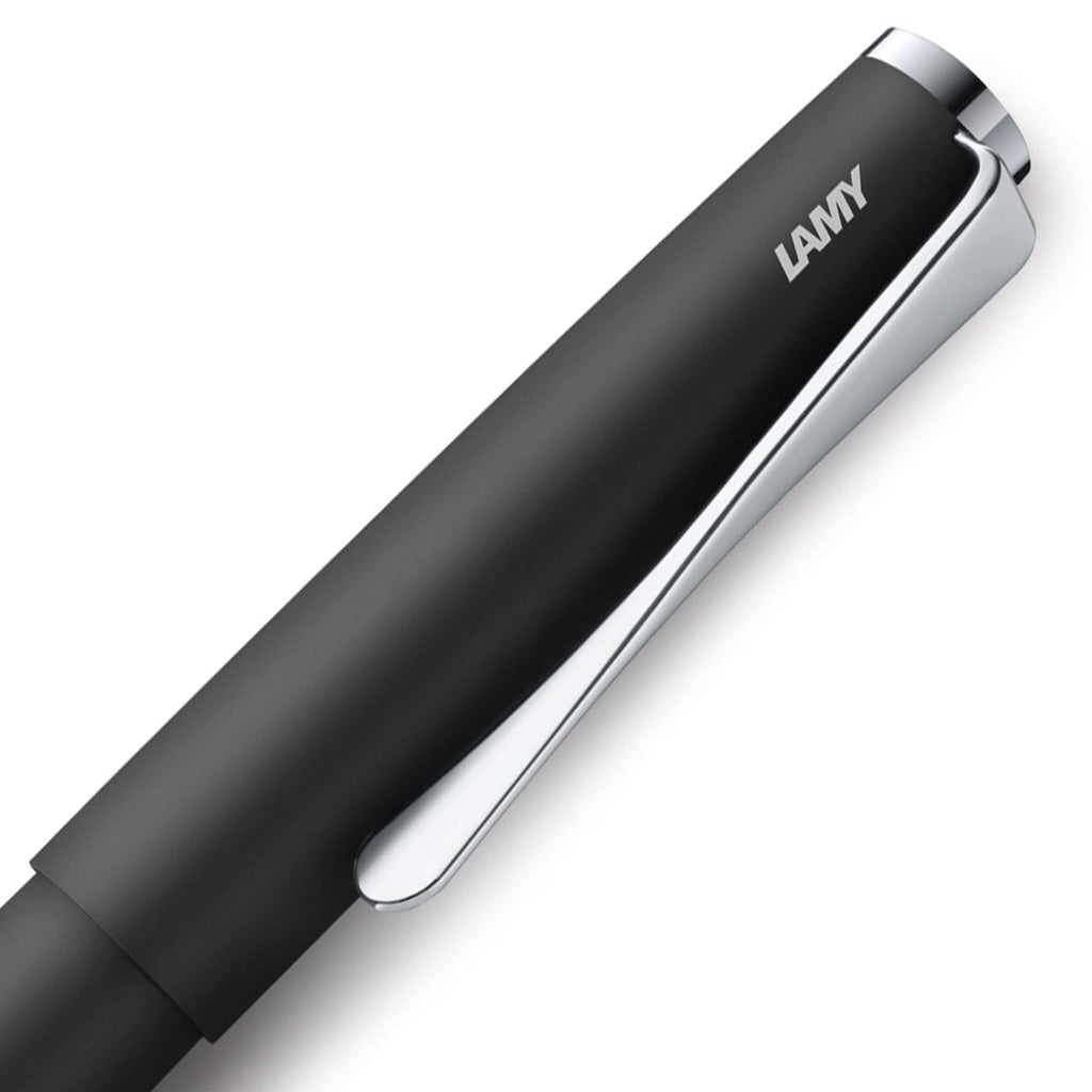Die schwarze Farbe, silberne Zierelemente und ein Design im Bauhausstilsind Hauptmerkmale des Lamy Studio Rollerballs.