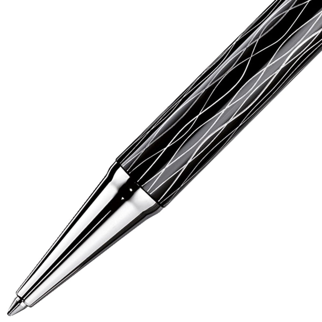 Der Otto Hutt Design 04 Kugelschreiber in schwarz wird mit platinierten Zierelementen vervollständigt und hat ein Design im Bauhausstil.