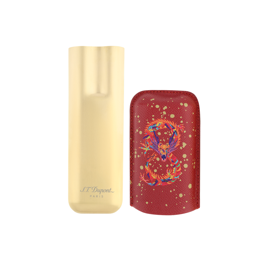 Das S.T. Dupont Etui für zwei Zigarren aus der Dragon-Kollektion vereint luxuriöse Materialien und exquisite Handwerkskunst. Gefertigt aus hochwertigem Kalbsleder in einem tiefen Bordeaux-Ton, wird es durch goldfarbene Akzente veredelt, die dem Etui eine festliche Note verleihen.