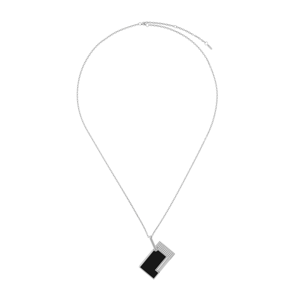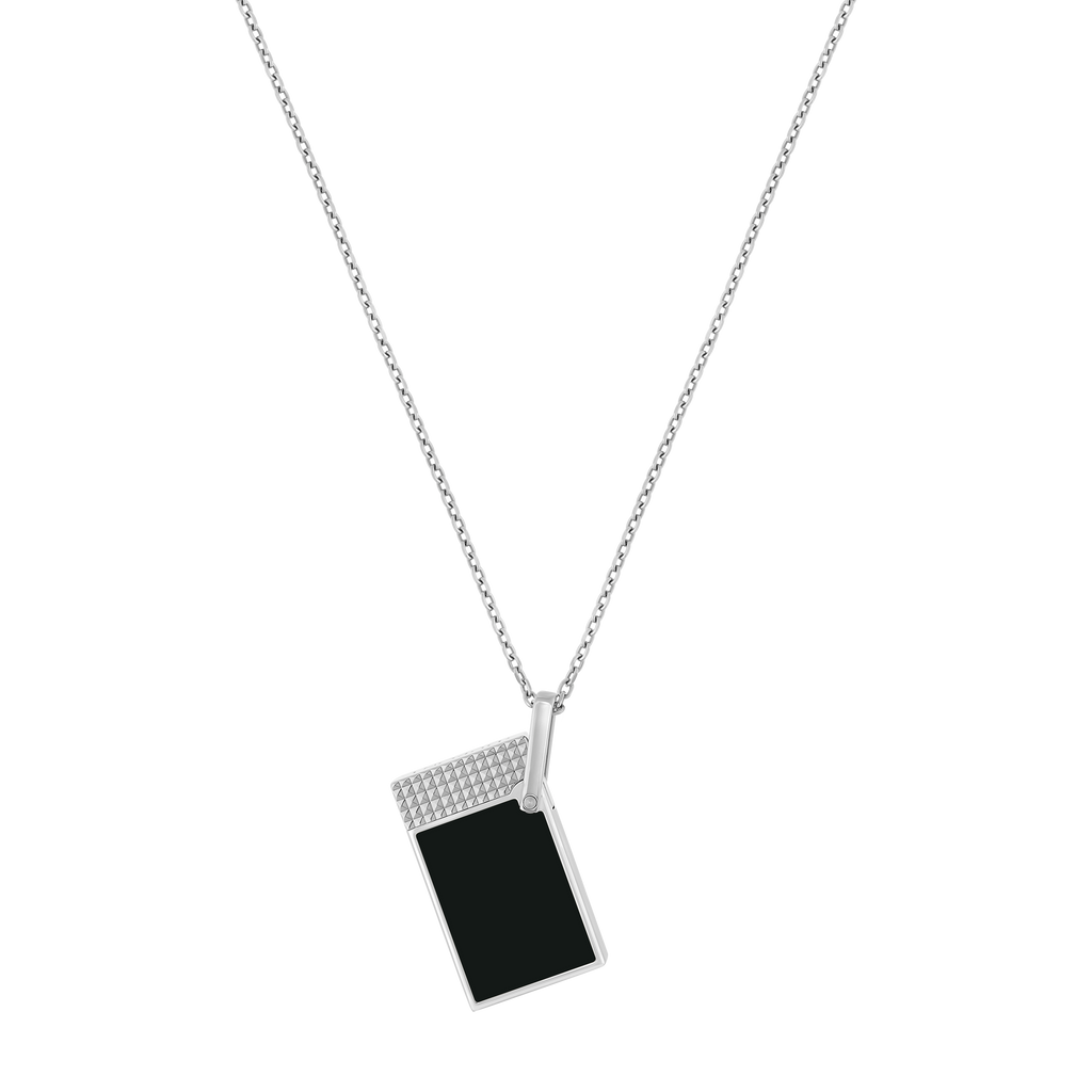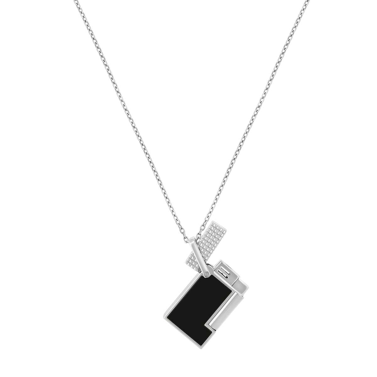Die S.T. Dupont Lighter Necklace vereint die ikonische Formensprache der renommierten Feuerzeuge mit der Eleganz eines Schmuckstücks. Der Anhänger besticht durch tiefschwarzen Lack und eine silberfarbene, palladinierte Metalloberfläche, die für eine luxuriöse und moderne Ästhetik sorgt.