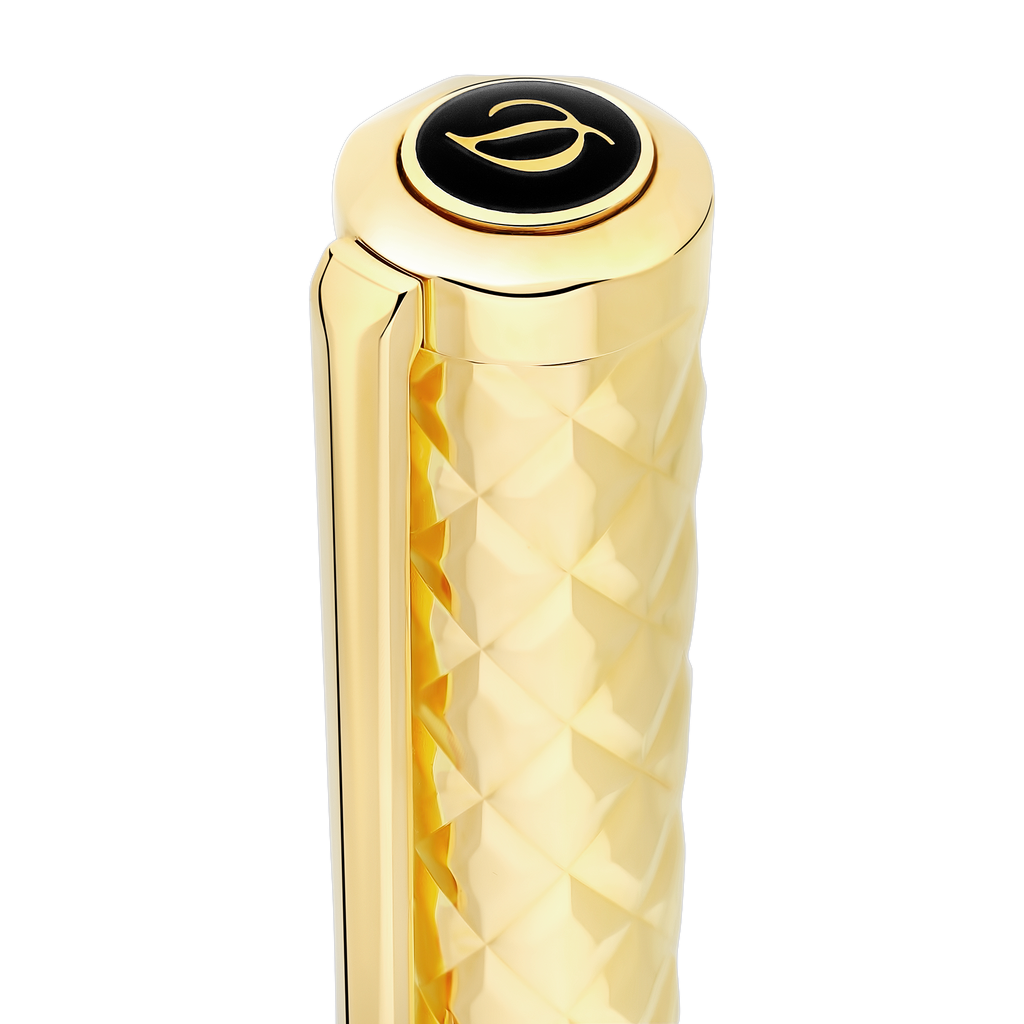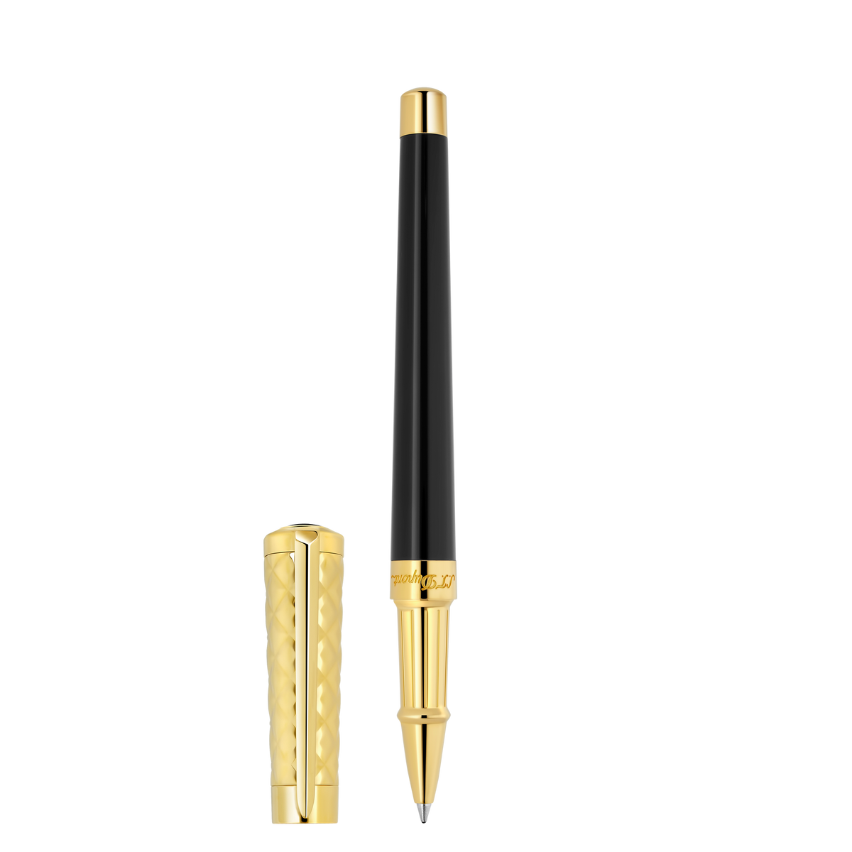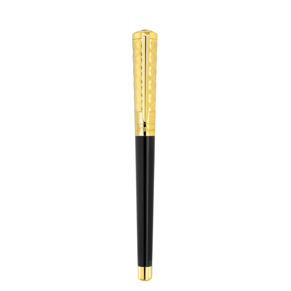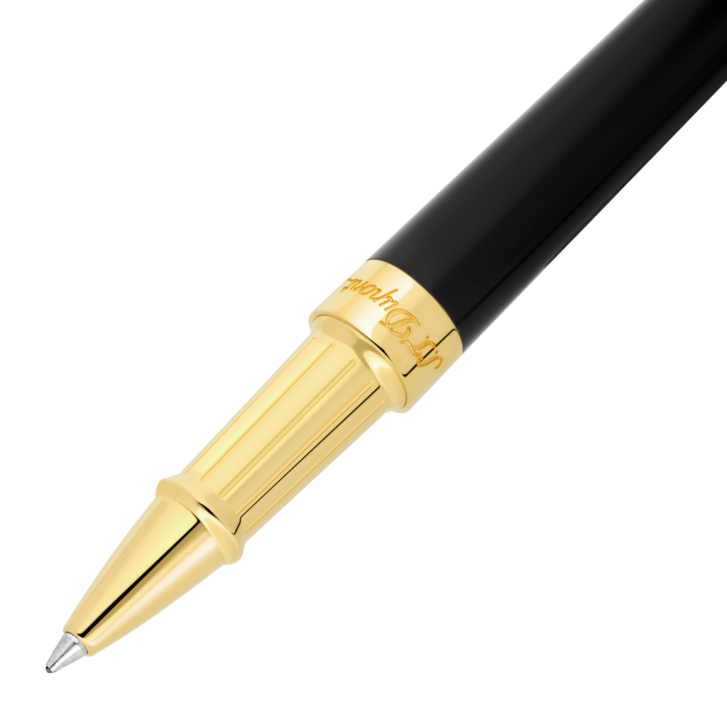 Der S.T. Dupont Liberty Duo Tintenroller vereint meisterhaftes Lackhandwerk mit der traditionsreichen Goldschmiedekunst der Marke. Sein tiefschwarzes, hochglänzendes Lackfinish harmoniert perfekt mit den präzise gearbeiteten Metallkomponenten, die in einem edlen Goldton erstrahlen. Diese luxuriöse Kombination wird durch die charakteristischen S.T. Dupont-Gravuren stilvoll ergänzt.