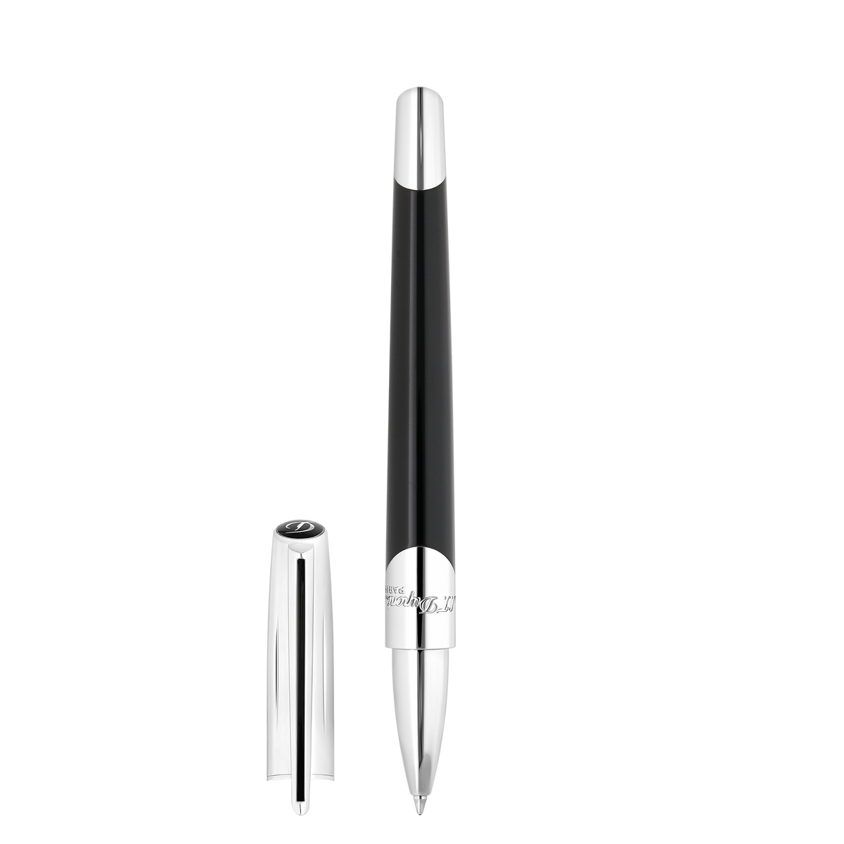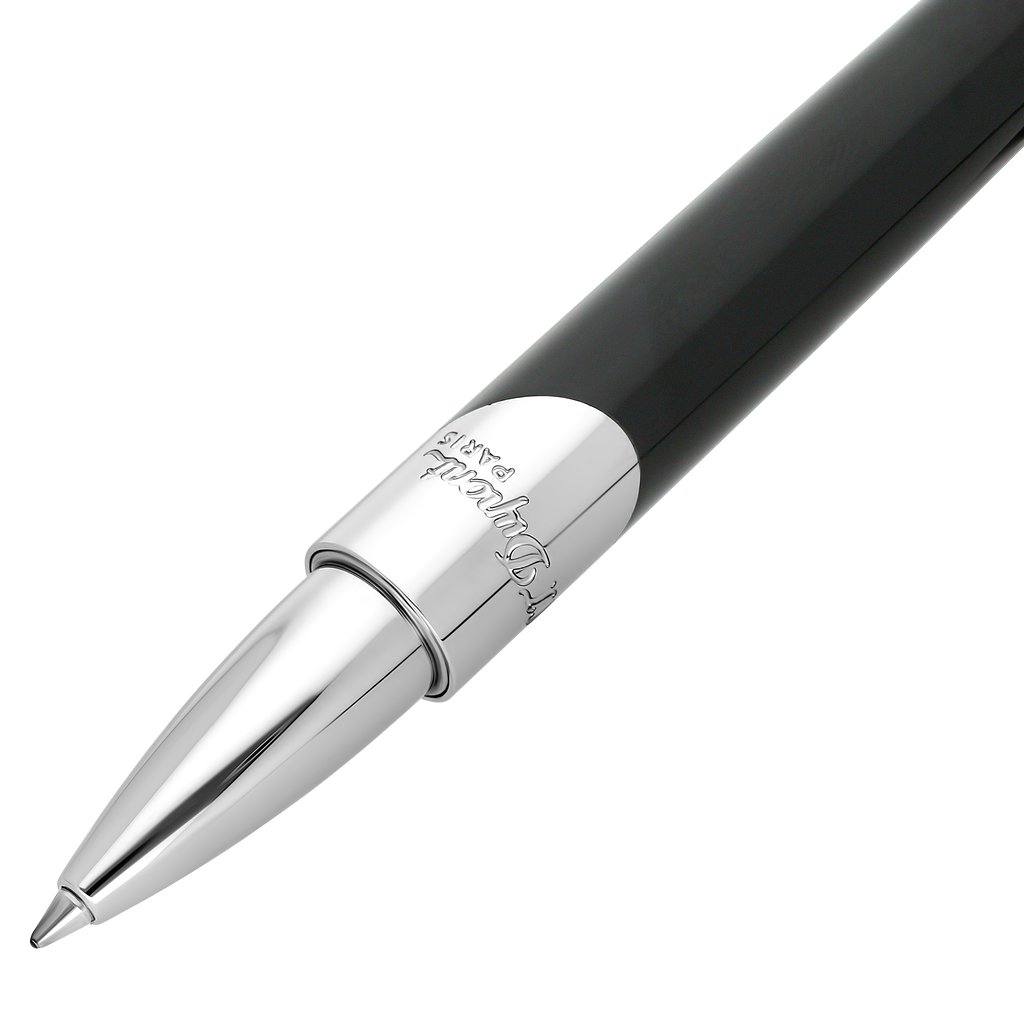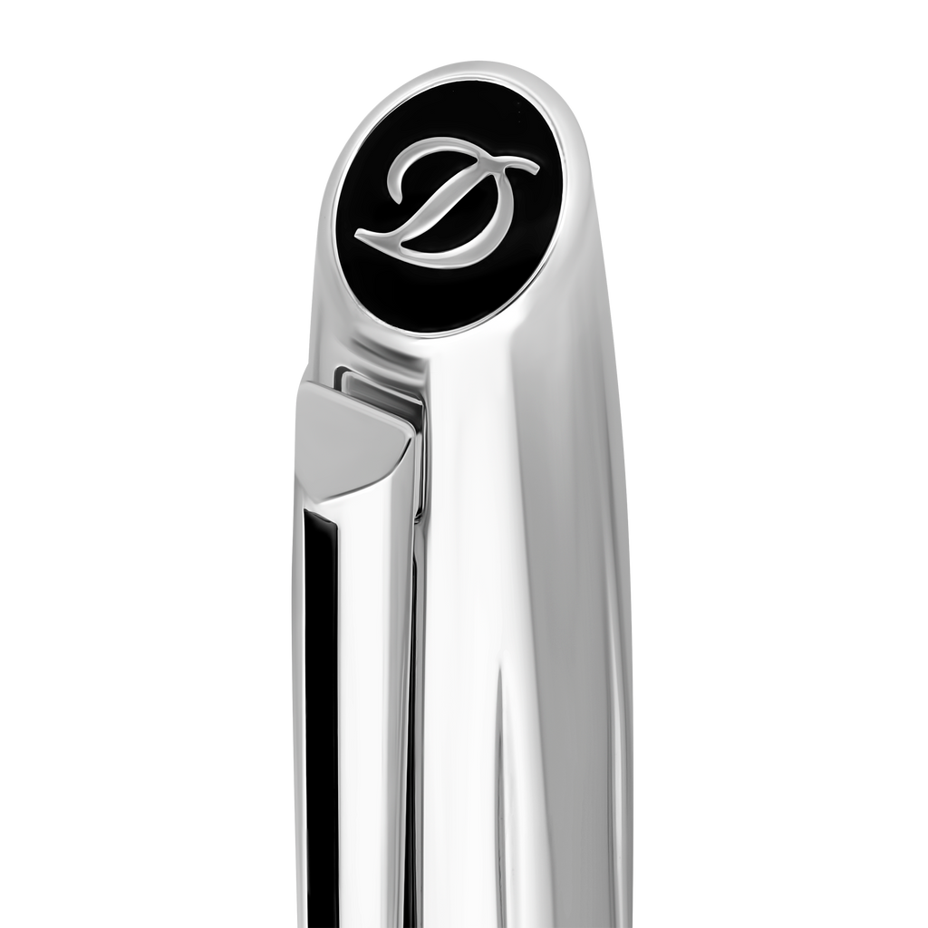 Der S.T. Dupont Tintenroller in Silber und Schwarz verkörpert die Essenz französischer Handwerkskunst. Mit einem robusten Metallkorpus und einer hochglänzenden schwarzen Lackierung bietet er eine elegante Kombination aus Stil und Funktionalität. Die silberfarbenen Zierelemente und der markentypische Clip verleihen dem Design eine zeitlose Eleganz.