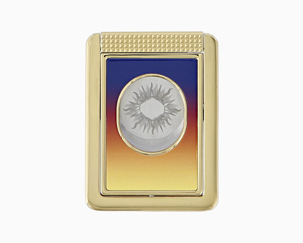 Das Gehäuse aus robustem Metall ist in einem warmen Aurore-Farbverlauf lackiert, der an den Sonnenaufgang erinnert, und mit polierten Akzenten veredelt. Die ergonomische Form bietet einen sicheren Halt, ideal für Aficionados, die Funktionalität und sammelwürdiges Design schätzen.
